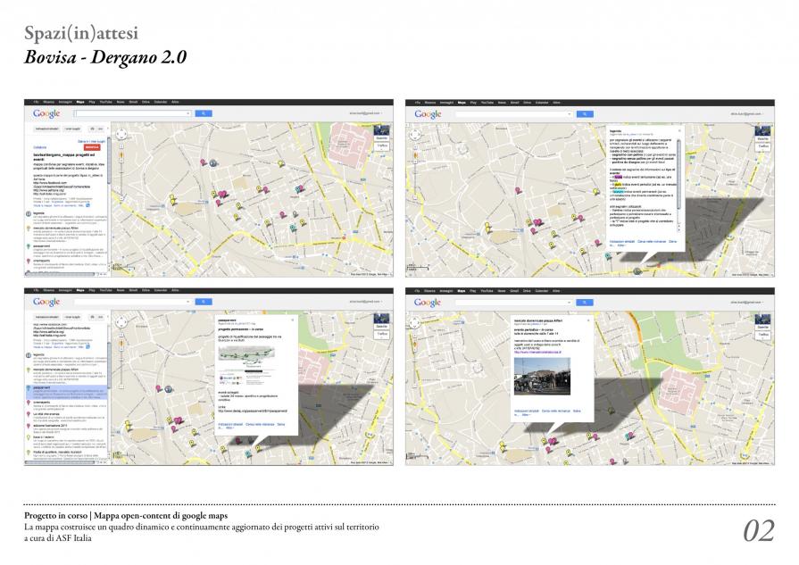 Il lavoro di mappatura svolto durante la settimana del workshop ha dato vita a una mappa online (P. 02 > Bovisa-Dergano 2.0) con contenuti liberamente modificabili dagli utenti (su invito), evolutasi nel tempo per fornire un supporto ai diversi contributi stratificati nel quartiere. La mappa, gestita da ASF-Italia, costruisce un quadro dinamico e continuamente aggiornato dei progetti attivi sul territorio di Bovisa e Dergano.