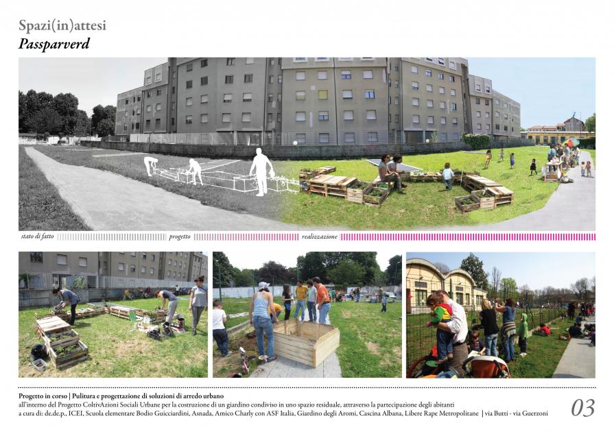 A) la collaborazione con progetti in corso - P.03> Passparverd. Prevede la pulitura e la progettazione di arredo urbano, all’interno del progetto ‘Coltivazioni sociali urbane’, per la costruzione di un giardino comunitario in uno spazio residuale attraverso la partecipazione degli abitanti.