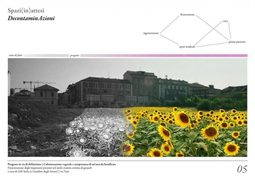 C) l’ideazione di progetti comuni - P.05> DecontaminaAzioni. Colonizzazione vegetale e temporanea di un’area da bonificare situata in adiacenza ai binari del tracciato ferroviario, dove si prevede un processo di fitoestrazione degli inquinanti presenti nel suolo tramite semina di girasoli (Heliantus annuus), adeguati all’estrazione dei metalli..