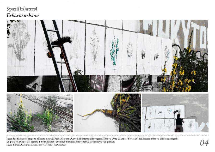 B) ripresa di progetti già svolti - P.04> Erbario urbano. Seconda edizione del progetto artistico site-specific di rivitalizzazione di un’area dismessa e di riscoperta delle specie vegetali pioniere, realizzato a cura di Maria Giovanna Govoni all’interno del progetto “Milano&Oltre: creatività giovanile verso nuove ecologie urbane”, organizzato nel quartiere da Connecting Cultures nel 2011 (www.milanoeoltre.com; urbanbackyards.blogspot.it).