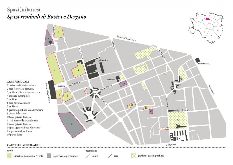 L’assetto fisico del territorio di Bovisa-Dergano (Milano) negli ultimi decenni è mutato. La delocalizzazione industriale e la conseguente chiusura e demolizione di molte fabbriche hanno lasciato grandi spazi vuoti, accanto ai quali (spesso di difficile riconversione a causa dell’inquinamento del suolo) esistono piccoli spazi inattesi, non utilizzati, privati, diffusi in maniera pervasiva in tutto il quartiere. Luoghi che esprimono un grande potenziale d’uso per gli abitanti e gli utenti, luoghi di possibile incontro fra le differenze, spazi in attesa.