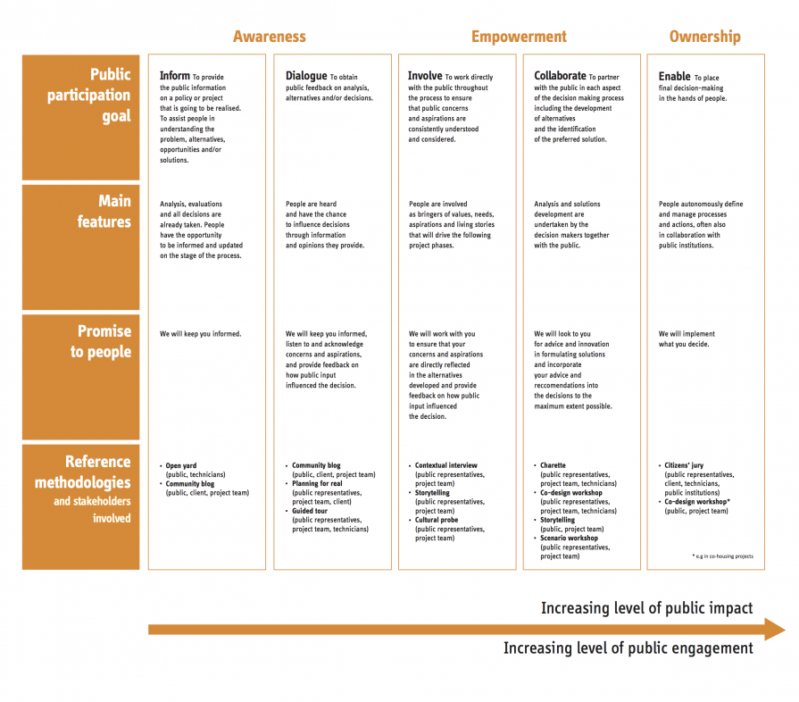 Methods are grouped around the categories of awareness, empowerment, ownership and describe their public participation goal, main features, promise to people, reference methodologies and stakeholders involved.