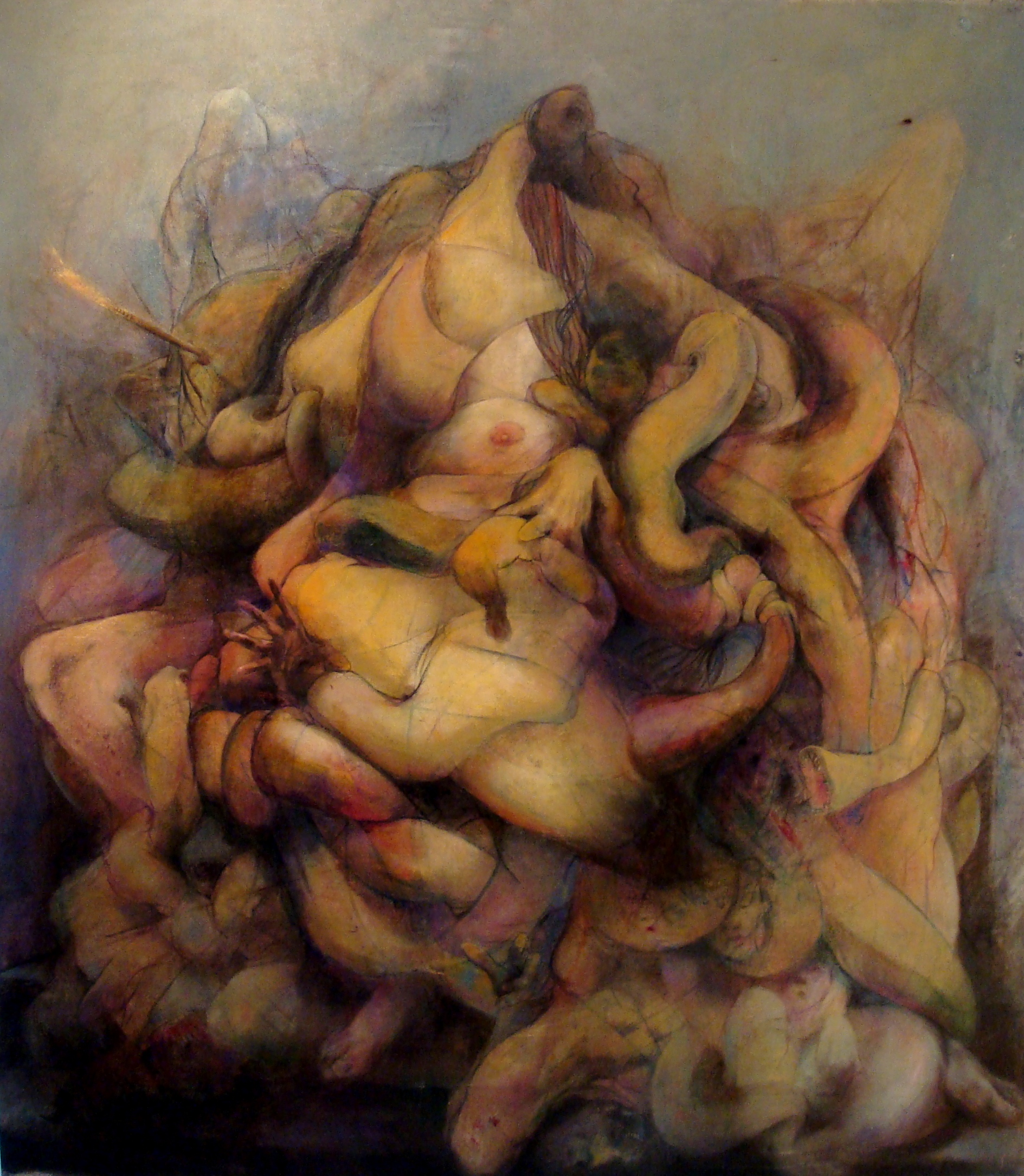 The various shapes and directions that art has taken throughout the years is what makes today one the most exciting moments to be an artist ever. Artists have never been freer and have never had as many resources or as wide a range of possible references to create art in history. The rich variety of the experiences of the past have enable artists to break into the fascinating world of visual expression in a way inconceivable one hundred years ago. Art making has never been as ambiguous as it is today. To be a contemporary artist and to express the metamorphosis that art has gone through one must take into consideration all that has been explored before. This concept has always been my concern and it is with that in mind that I base my art investigation. The current subject of my creative research draws upon the engagement of the work of the masters of baroque painting with the art produced in the twentieth century. In other words, it deals with the inherent antagonism of abstraction and figuration. By articulating with these traditions I intend to build a unique body of work that collapses the edges between abstraction and representational painting. My intent is explicit in my painting Occupy (please refer to image#1). It depicts a mythological serpent-like creature attacking and strangling a biomorph being mother in a epic scene. Part of the pictorial elements were intentionally made not too conspicuous, or abstract while it was my decision to limit the figuration to a few essential features. This is a painting about action, movement and emotion. As far as subject matter goes, it was my goal to create pictorial response to events that humanity has recently witnessed. While the world is dealing with economic upheaval and political turmoil, where people live the imminence of a new major natural disaster and the threats of a new revolution or war. My goal was to create a depiction of the despair, fears and struggle of people all over the world; a statement about the human condition in the twenty first century. Greek art has always been an influence in my work. This painting in particular was inspired by the Hellenistic sculpture titled “Lacoon and his two sons”.