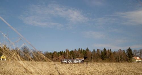 Train TV consists of 28 signs installed in the landscape along the railway between Stockholm and Uppsala in Sweden. The signs look like subtitles and are visible from the train window. When the passenger looks through the train window and sees the bypassing landscape, the experience resembles watching a movie. The lines of the signs form a dialogue, but can also be read separately. The installation takes place between April and September 2012. Webpage with images and texts: www.tagteve.com