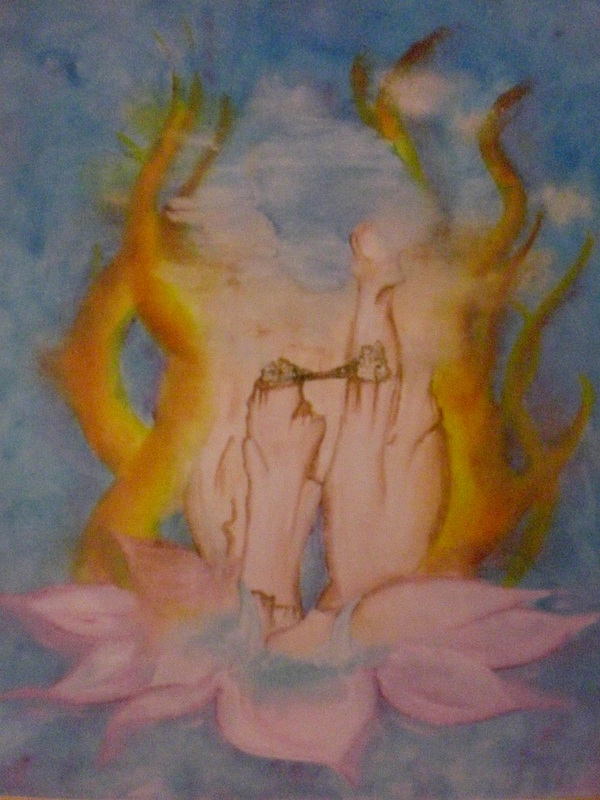 Rappresenta la figura di un uomo accovacciato immerso nella natura quasi da perdere la sua forma originaria;dai piedi che si immergono nell'aqua che danno vita al fiore di loto al capo che si perde tra il cielo terso e le nuvole . Tra le ginocchia un castello medioevale che ci riporta all'umanità dell'essere umano .Contornato da fiamme che riscaldano e riportano a casa