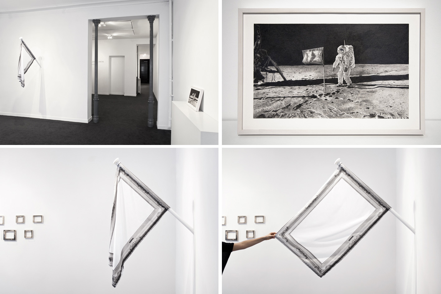 The frames or images of the conquest of the moon pertain to different moments, diverse pasts that go hand in hand –or they come together in a conflictive way– with the presence of the real flag in the gallery space, which, together with the resonating images of the conquest of the moon, functions as an element of the temporal connection between the image and reality. The image of the flag and the actual flag together activates spatial and temporal connections in the spectator's mind, almost the same way that Roland Barthes' "that was there" in "Camera lucida", in which here is reformulated through "that could not be there". Reality and fiction, real and imagined space –impossible– establish a dialectical game that grows even more complicated with leaps of time.