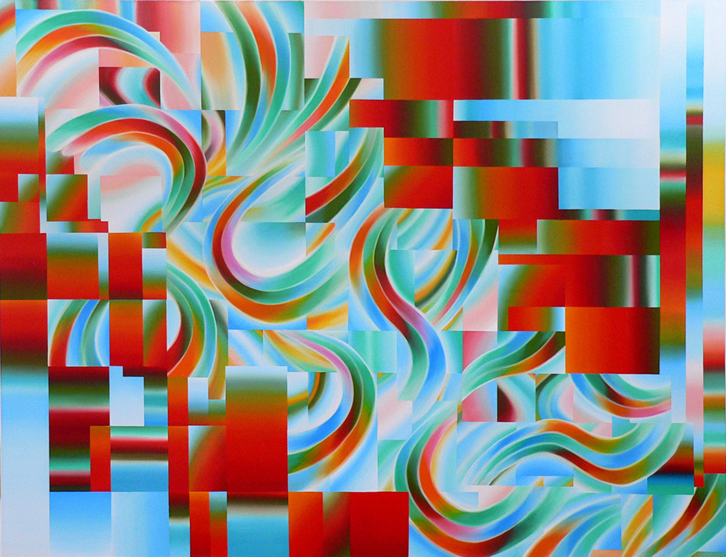 I think of Isomer as a non-representational landscape. A dominating structure of blocks moves in from the edges of the painting, opening towards the centre to reveal a spatial field. Here looser organic forms subvert the grid’s rectilinear order, creating tension between the opposing visual laguages.