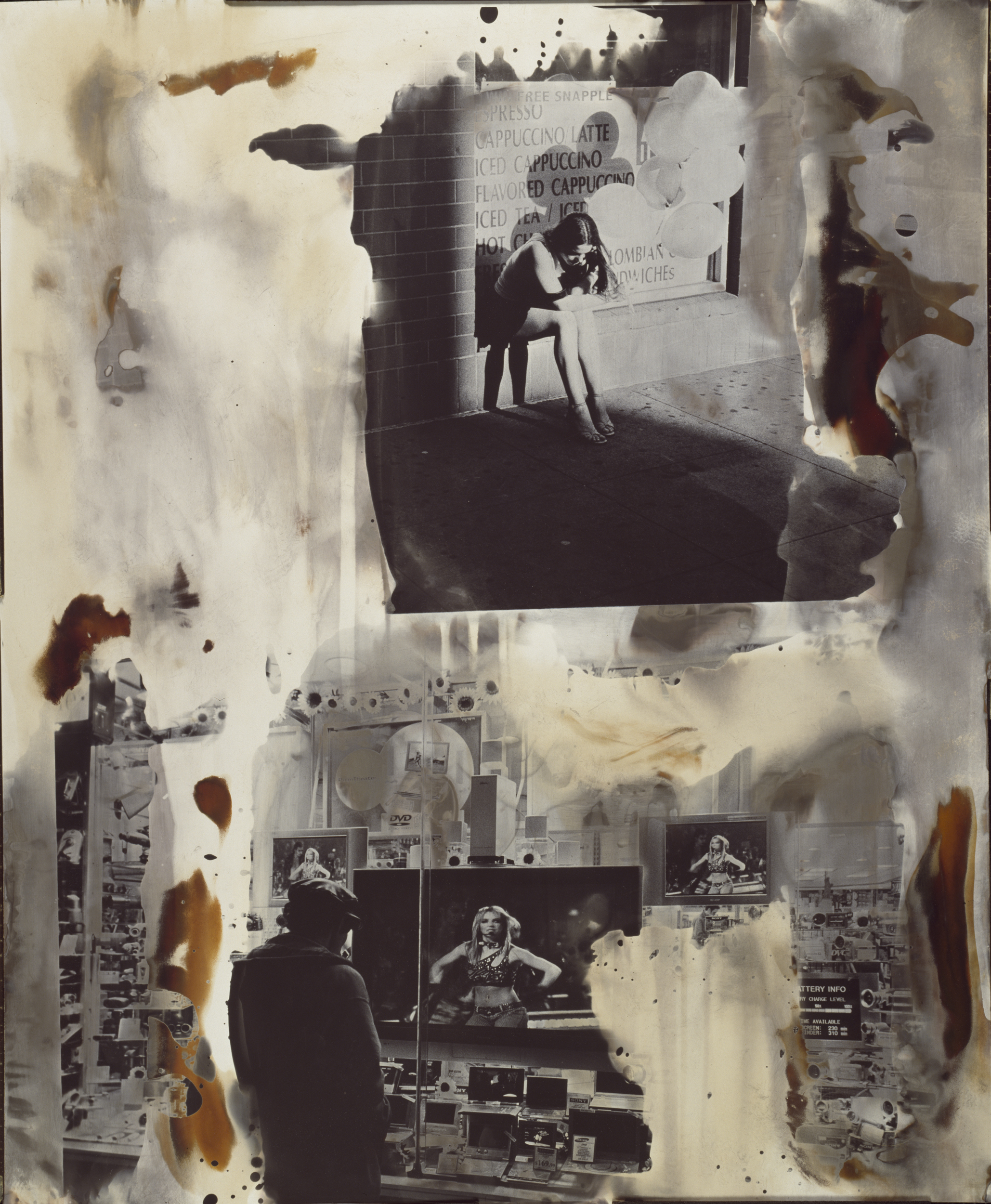 This work represents a hybrid of the aesthetics employed in classical painting and traditional photography. Juxtaposing my own photographs allows them to speak to each other, opening up the visual field in a way that creates dialogue and makes space for new meanings to emerge. Applying chemicals to the photographic paper while controlling their exposure to light gives texture and dimension to these images. I embrace the world of painting through alchemy in ways that echo the drips and brush strokes of abstract expressionism. Traditionally captured images of contemporary life are contextualized in an emotionally laden and aesthetically nuanced landscape. These risk taking techniques bring new energy to my photography.