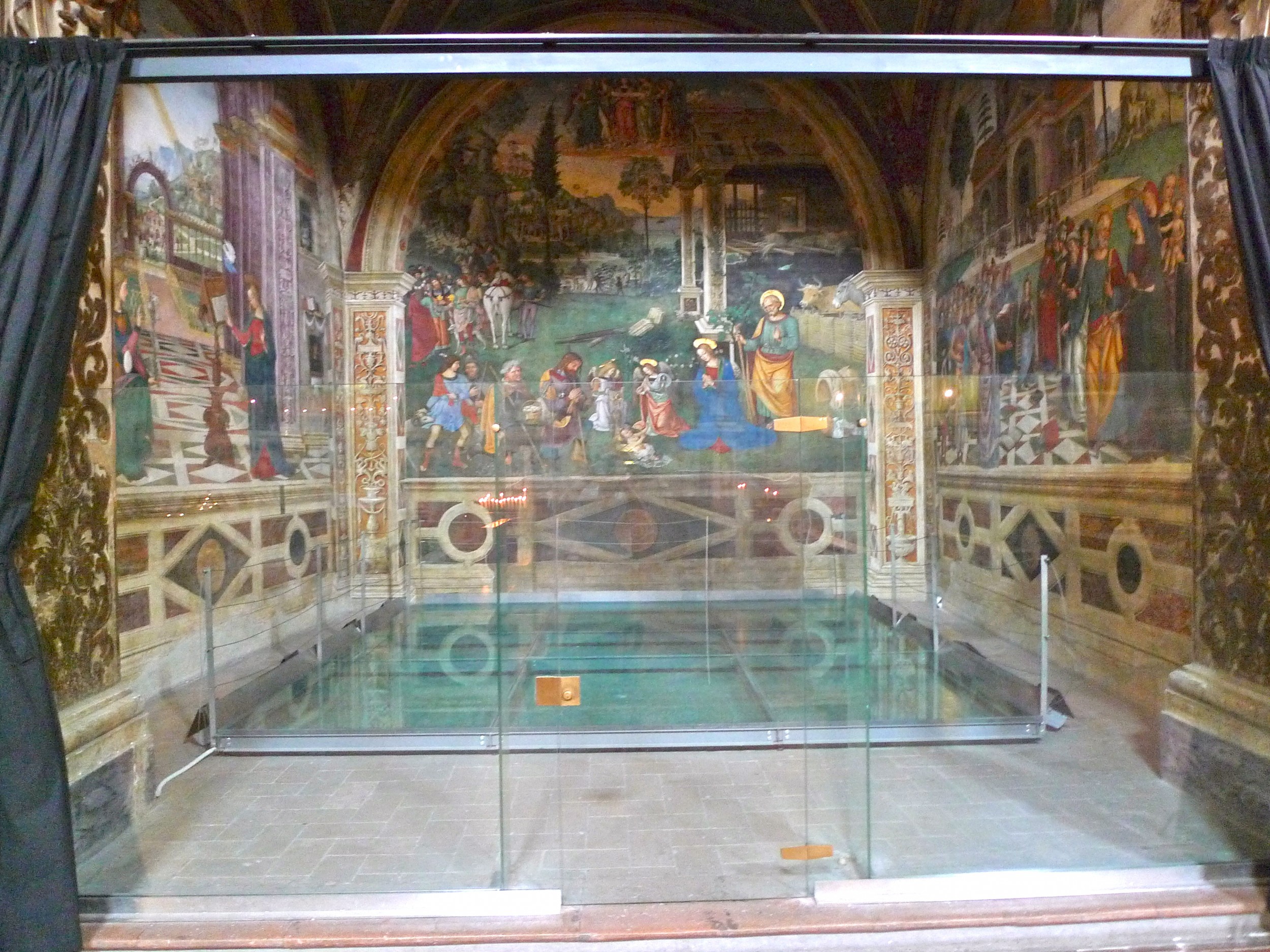 Nella foto la “cappella bella” è chiusa da un sipario oltre che da vetrate. Il sipario è il ridicolo della sovraintendenza, si continua a “teatralizzare”… l’idiozia degli eventi.