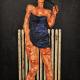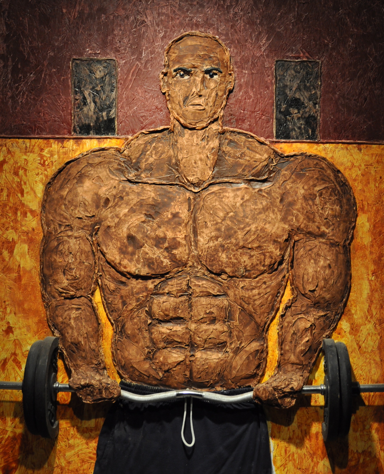 This work expresses the decision of continuing on my path without being distracted by those who walk another. I believe it takes an immense strength of will and determination to do so , to not follow and have blind faith that one day you will lead. I cut real 25 lbs dumbell weights and curl bar attached them to my panel and sculpted the arms to reach out of the canvas to hold the weight. Marbles in place of his eyes and real gym shorts no brush ,poured acrylic mixed with water