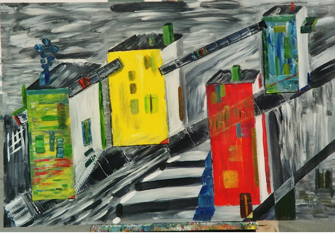 city districts. In this painting the atmosphere in a high-rise settlement is being