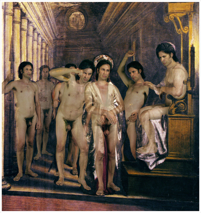 Scelgo opere di altri che raccontino delle esistenze, da esse, attraverso una sorta di performance teatrale, ricalco e mi approprio delle posizioni, delle espressioni, delle emozioni dei protagonisti e delle comparse. Per ogni posa assunta vengo fotografato in modo da potermi successivamente sostituire a tutti i personaggi rappresentati.