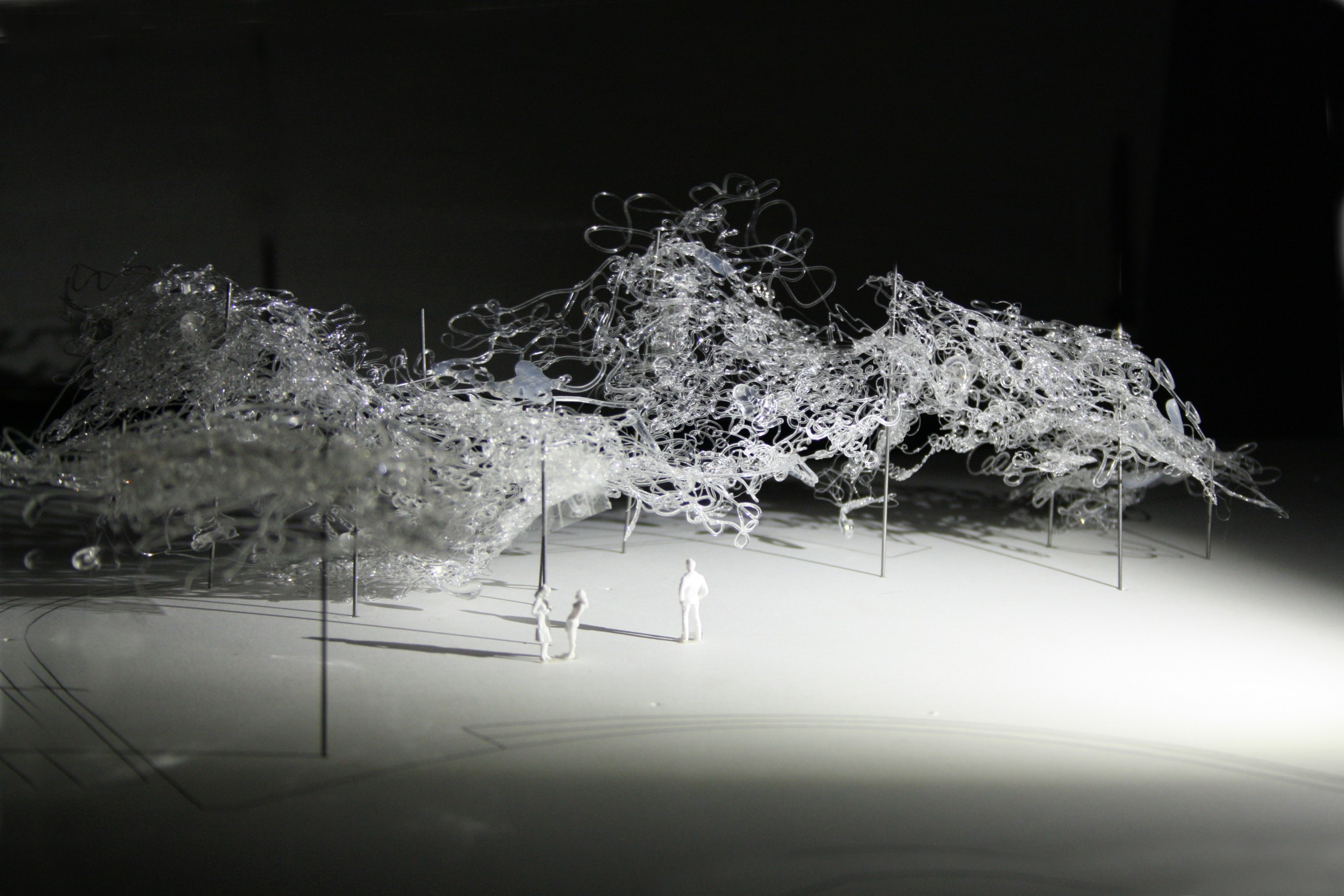 The installation consists of a structure of metallic pillars that converge on superposed layers. Each layer is made of strands of a special type of polycarbonate organic light crystal, very clear, virtually unbreakable, with a high brightness that, allows creating pieces which are unique in shape and design.