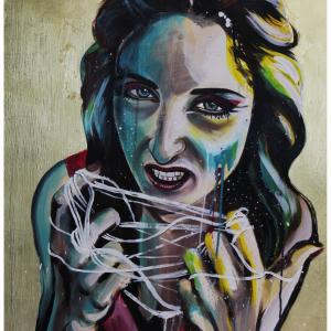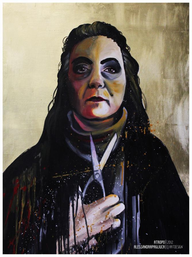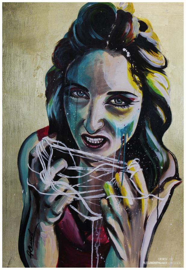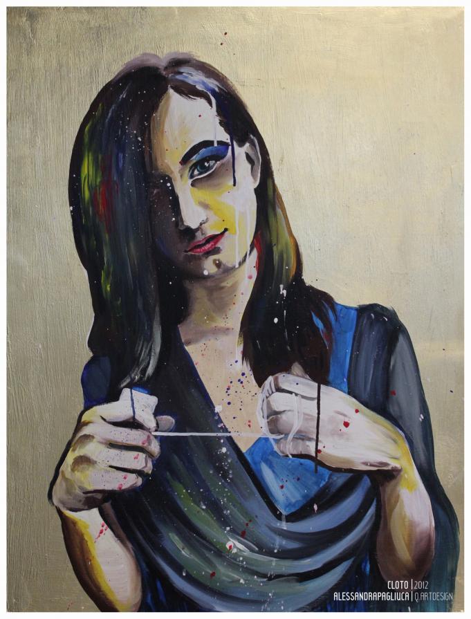 In questo progetto vengono messi a confronto due antichi miti, il primo, quello delle Moire, rappresentato in un trittico ad acrilico su legno con foglia d'oro, in cui sono presenti le greche "Dee del Fato", le tessitrici, che srotolano il filo della vita e ne segnano la fine.