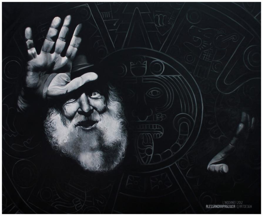 Nell'ultima opera, "L'Indovino", realizzata ad olio in grandi dimensioni, siamo messi di fronte ad una vecchia profezia Maya che prevede la fine del mondo proprio nell'anno 2012. Un mago, o un indovino, un moderno Nostradamus si protende con le mani verso di noi come per predire un disastro. Potrebbe essere solo un pazzo visionario, o un vecchio spaventato dalla morte.