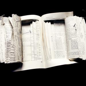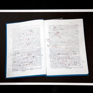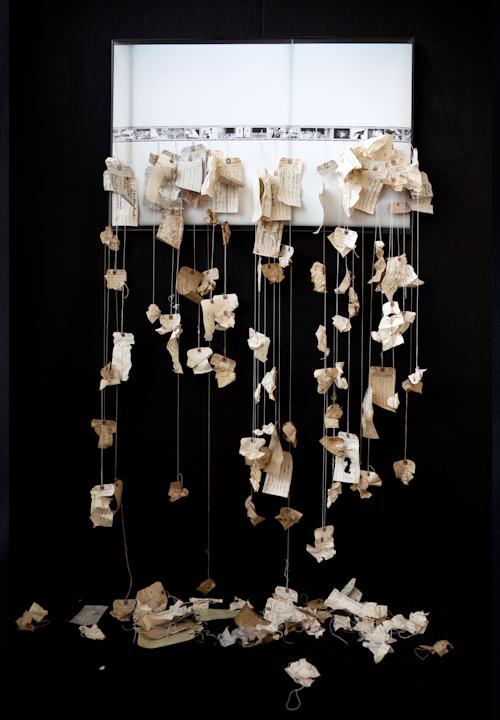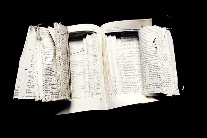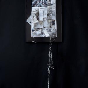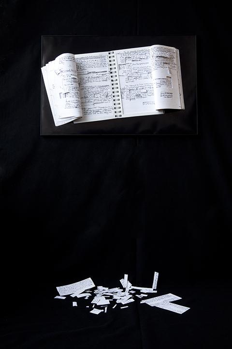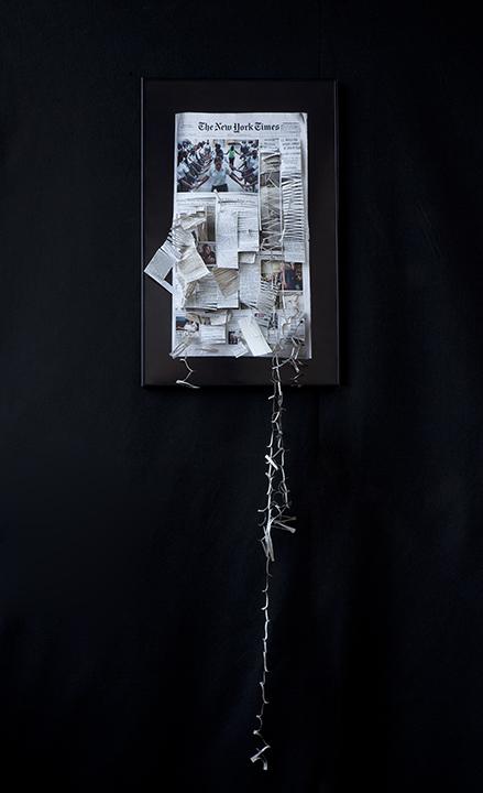 I find that written and visual information has incredible power on our actions, thoughts and relationships. Information is formed effortlessly, through interpretation. When it’s created and executed, it is no longer in the sole possession of the creator, leaving it vulnerable and open to re-interpretation. Many times many people share similar thoughts, creating different ways of transferring those ideas. How that information survives, depends on the one(s) who decides to carry it forward. This constantly reshapes a concept for people to understand, and it could lose its original meaning. That’s what makes research important, providing substance from additional resources strengthens what is delivered, but how is it that we determine what information holds more value? These ideas are communicated by combining traditionally separate disciplines such as installation, sculpture and photography and the surfaces of the printed media used are disrupted by physical alterations through sewing, dissecting, writing and pinning. Using existing objects that contribute to the sculptural element of the work with stories of their own, that serve as tools of organizing, identification, and creation of these histories.