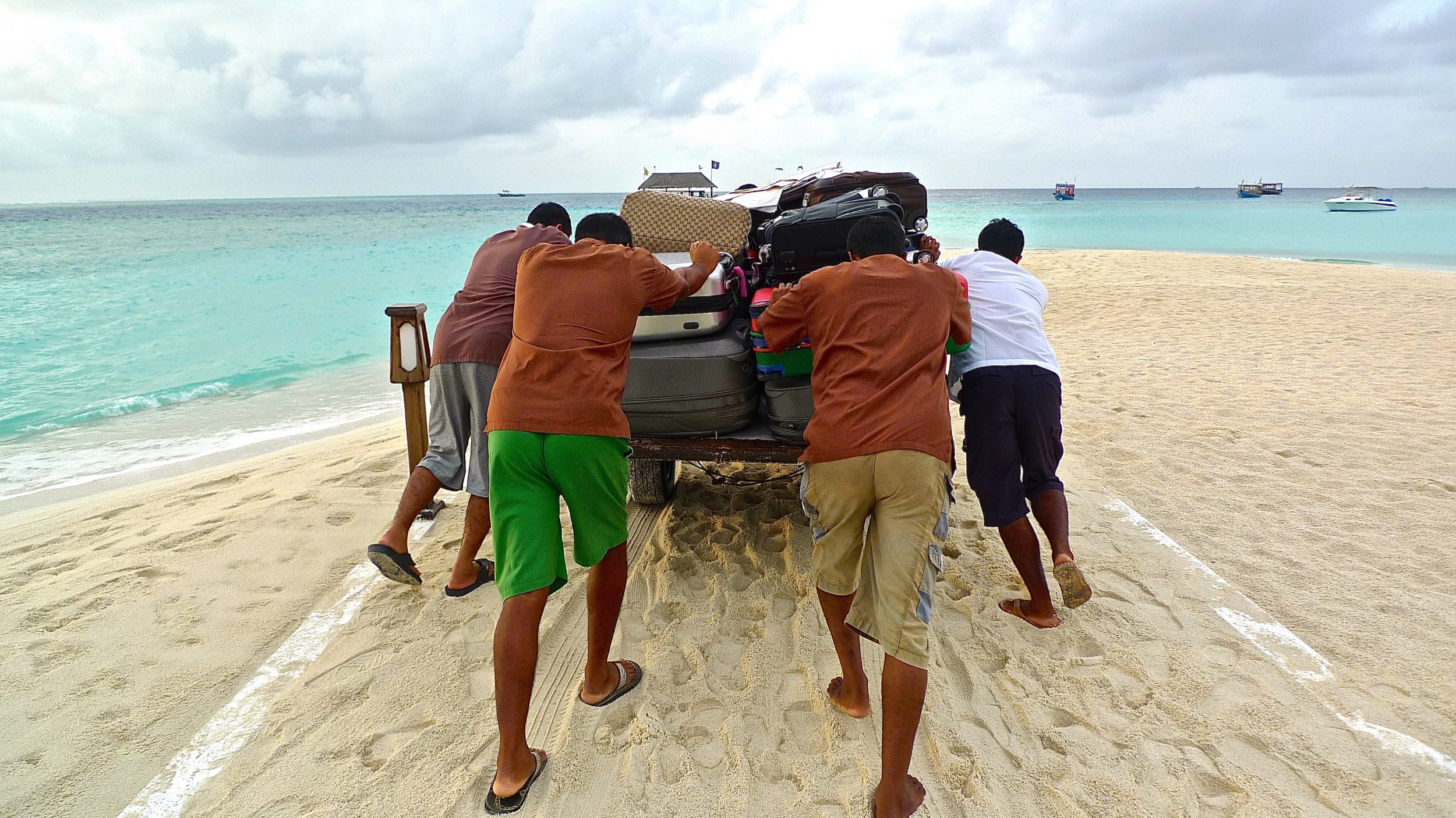 Alcuni di questi per tutto il giorno non fanno altro che raccogliere foglie, un lavoro affatto faticoso, altri spostano e separano la sabbia fine e allontanano i corpi pungenti corallini dal bagno asciuga, altri sono attenti a che la sabbia corallina non rimanga troppo allungo nei bungalow. Altri sono nelle lavanderie, altri nella ristorazione. Solo uomini, uomini senza donne.