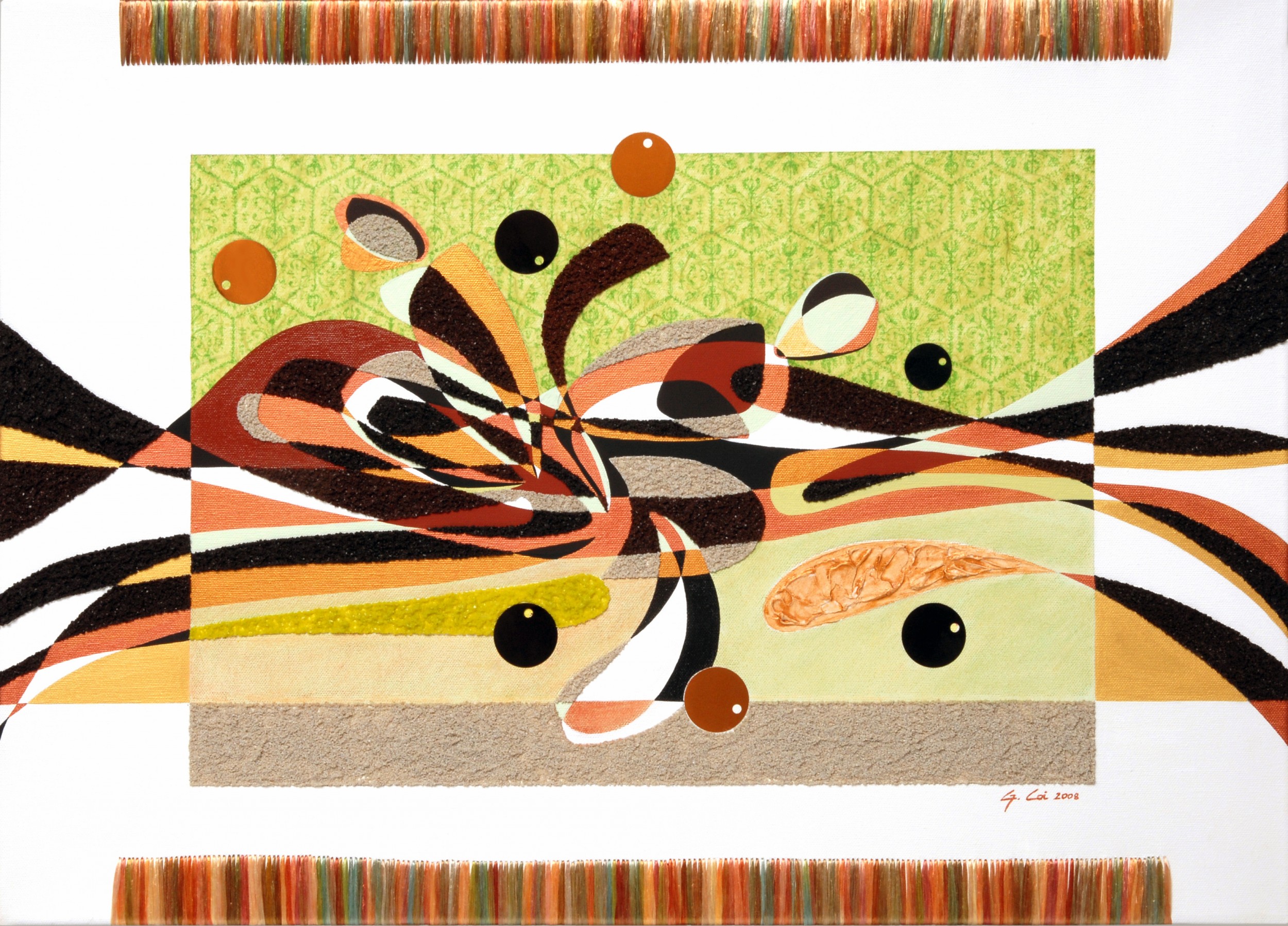 Materials: Canvas, Acrylic, Raffia, Paper, Beads.