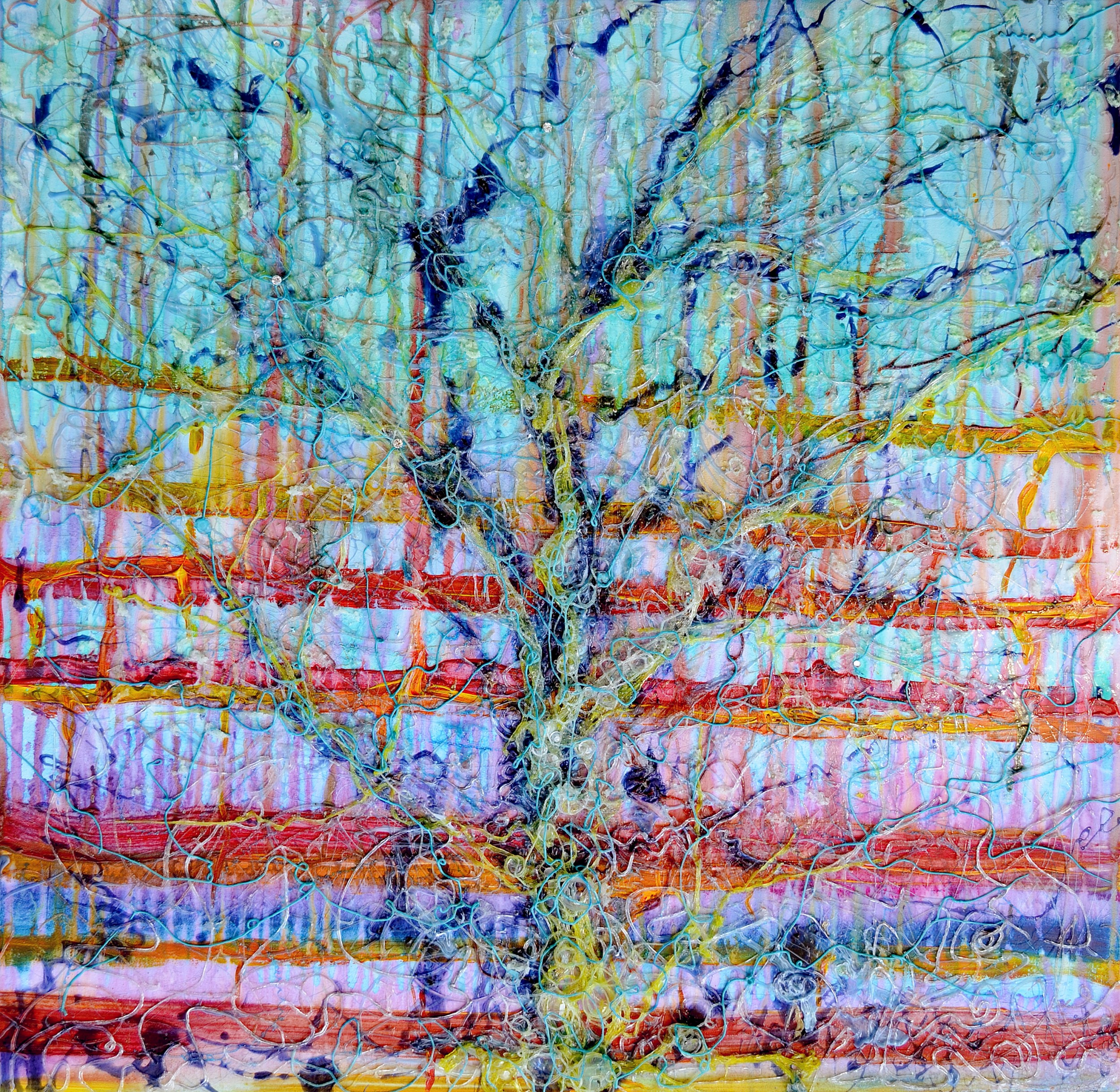 In order to keep the feeling of the painting atmospheric and to portray the subtlety of shared air, the tree symbol coalesces out of many fine threads of extruded media. These threads wend curved, seemingly random paths through to the edges of the painting. Tiny glass beads were adhered to the extruded threads of media for a sparkling atmospheric effect. the background was painted using a water color and drip technique to create loosely defined and interconnected layers. this pattern is a reference to the layered structure and interchange of gases in the atmosphere.