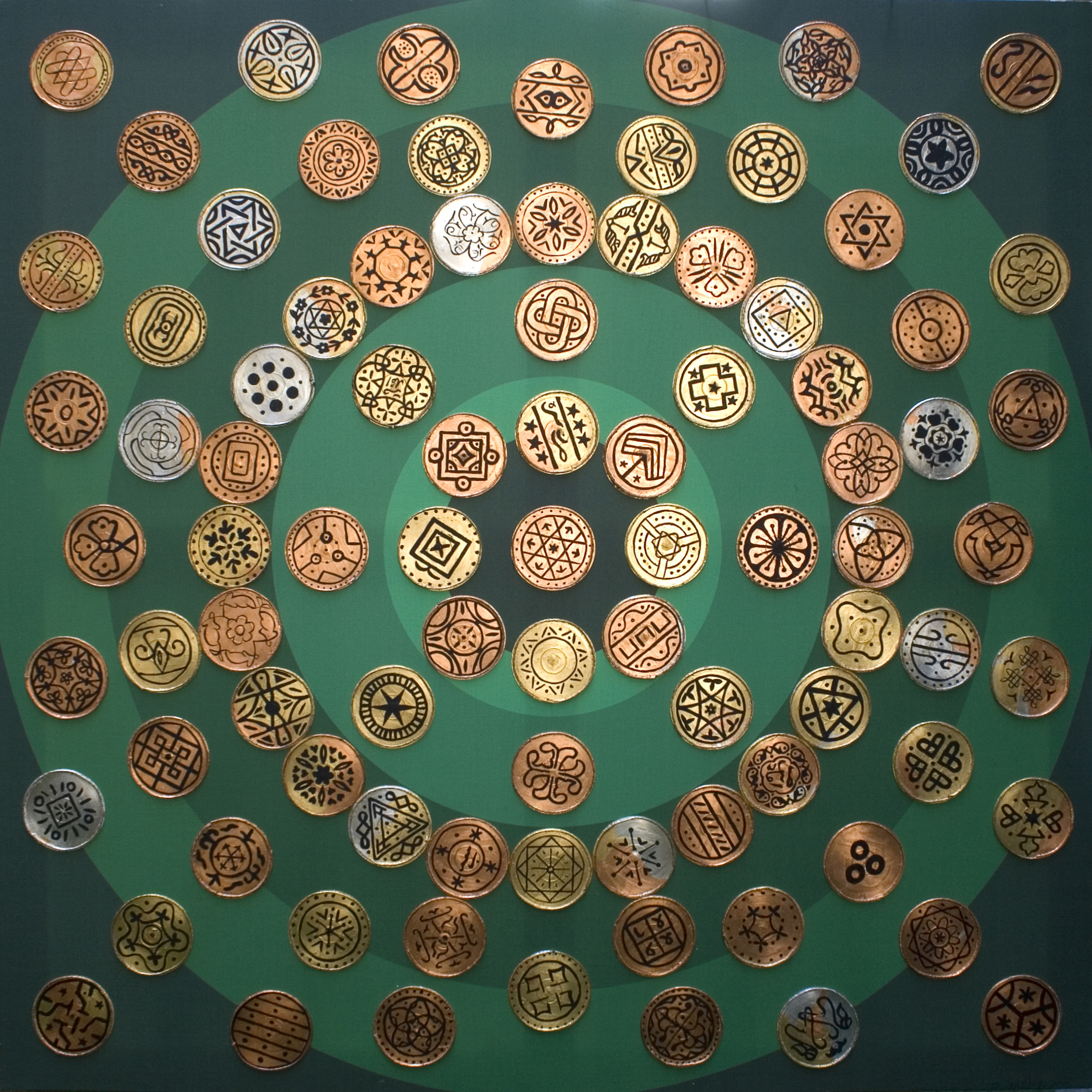 Combining the marvelous design of CDs, thousands of which are every day junked to technology garbage, with aesthetics of old coin and money embroideries has come out to be a game of fun for me.