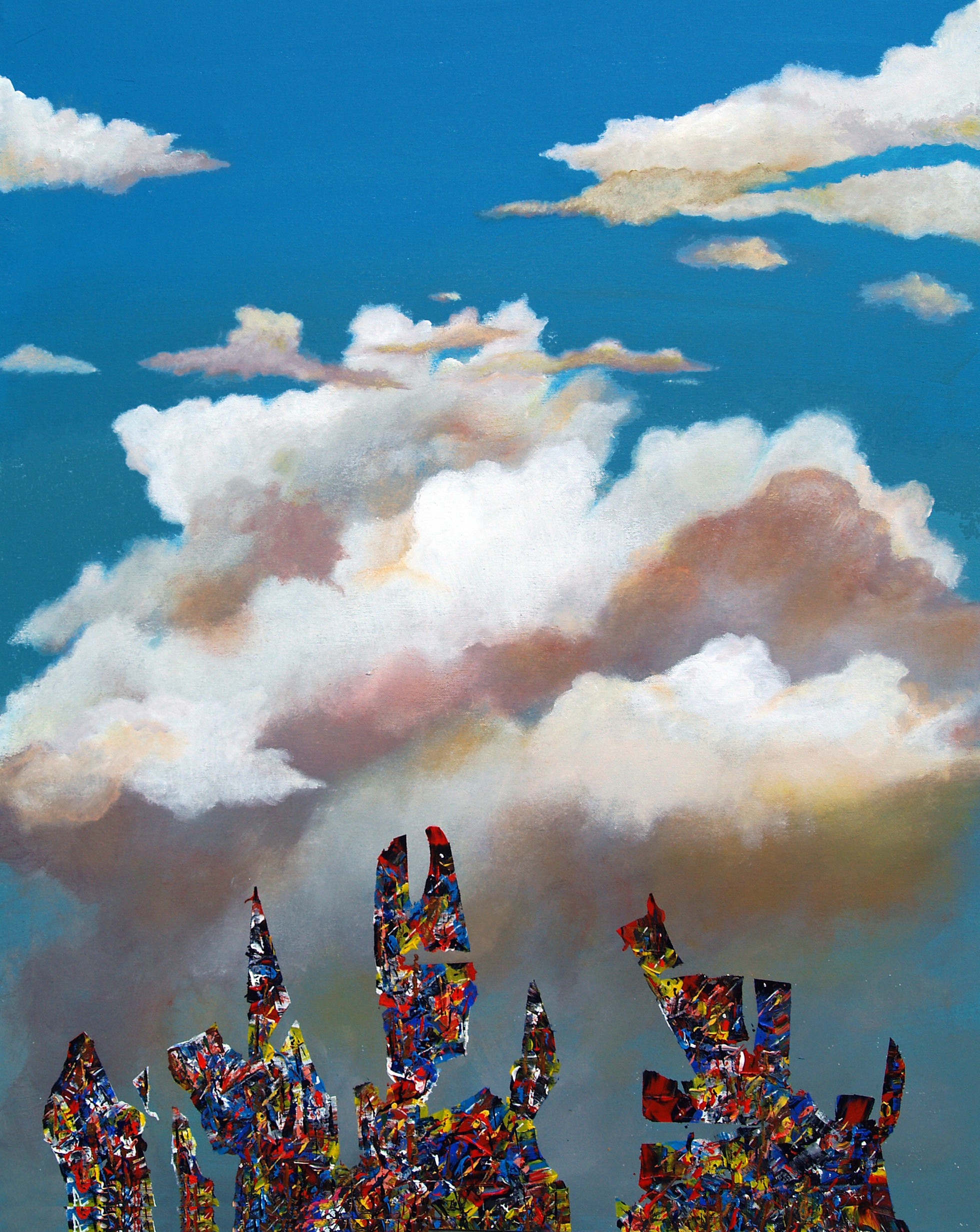 Le varietà di questi cieli, serenamente limpidi, oppure notturni e vellutati, accesi di luci apocalittiche o cristallizzati nel grigio del monocromo, è una continua sfida lanciata ai nostri sensi. Ed è lo scorrere delle nuvole che segna il senso del tempo in queste Attese: nubi soffici, nubi minacciose, nubi che riflettono un sole lontano e freddo, nuvole realistiche, nuvole bambine. Questi cieli complessi, così elaborati con consapevolezza e padronanza, intessono un dialogo misterioso con le forme degli astratti, che appaiono come skyline di città devastate, animali dialoganti, realtà proteiformi.