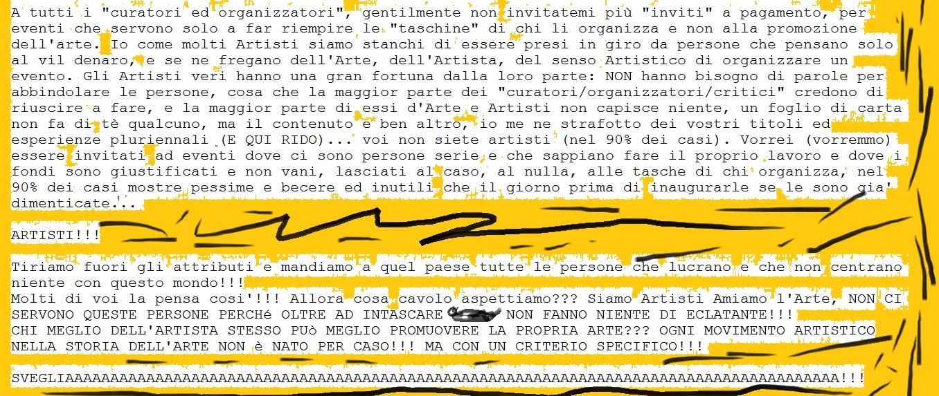 Caro William che di pacifico hai ben poco. Non agitarti e lascia che ognuno faccia quello che vuole (evviva la libertà)! Ignora gli inviti a pagamento e proponiti come artista come sai fare. Ciao.