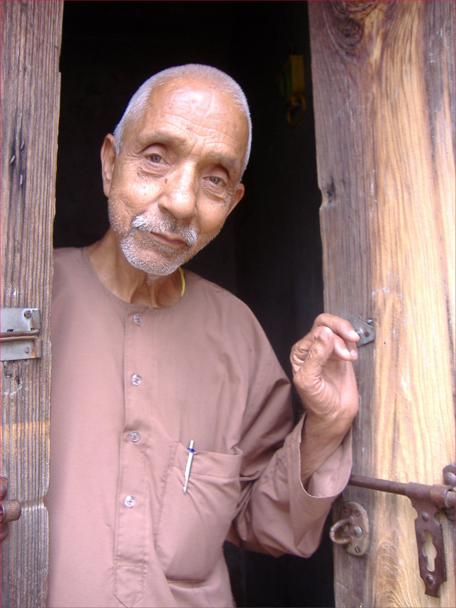 A photography of an old Indian man between a wood door. His face is so innocent and his eyes are full of love.