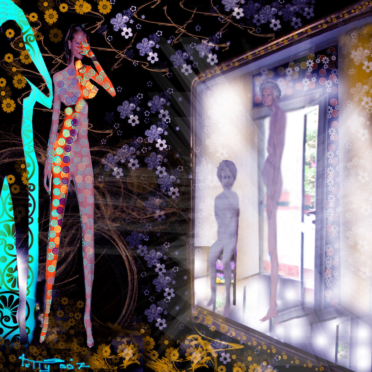 Suggestiva, l’immagine della donna di notevole bellezza, che riflette la propria figura in un grande specchio; da dove raggi di luce irreale fuoriescono, fluttuanti nell’area circostante. Nello specchio non si intravede la giovane donna, bensì una vecchia e una bambina: il passato e il futuro.