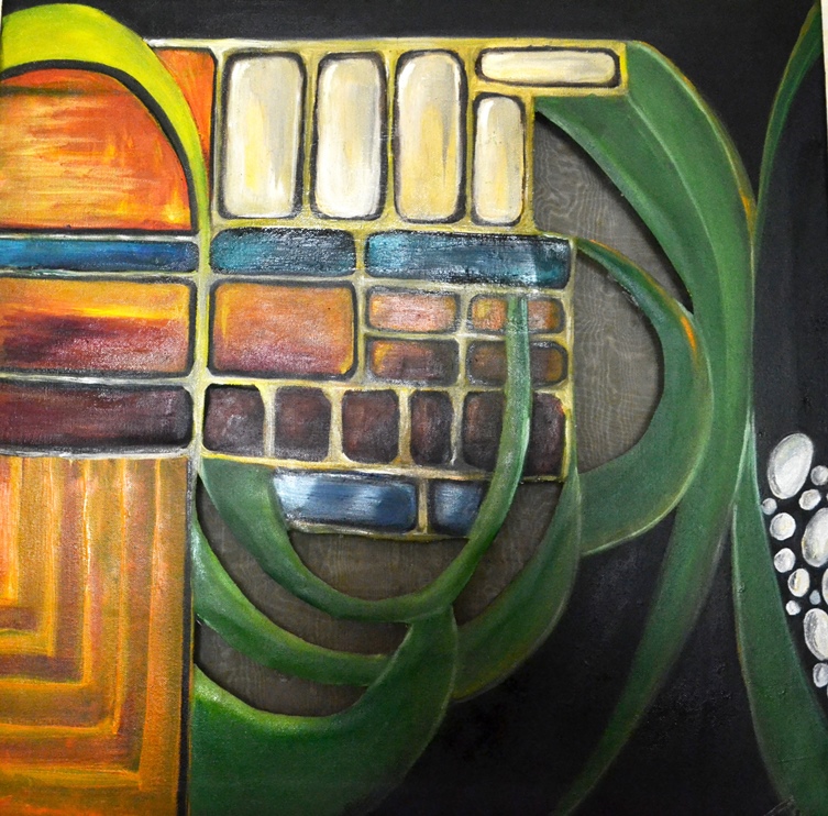 In uno sfondo nero come a percepire il profondo, si espande da fili d'erba una visione più allargata dell'oggetto, come serie di ingrandimenti che mostrano la divisione cellulare delle foglie in un gioco di luci e colori che interpretano l'energia vitale della pianta . guardare l'infinitamente piccoli con occhi di meraviglia è il concetto che si ripete in queste opere, dove appunto i sassolini bianchi ai bordi del quadro ci ricordano, che anche l'insignificante fa parte della nostra esistenza . Il lavoro eseguito ad olio su tela presenta dagli squarci da cui si intravede un tulle nero .