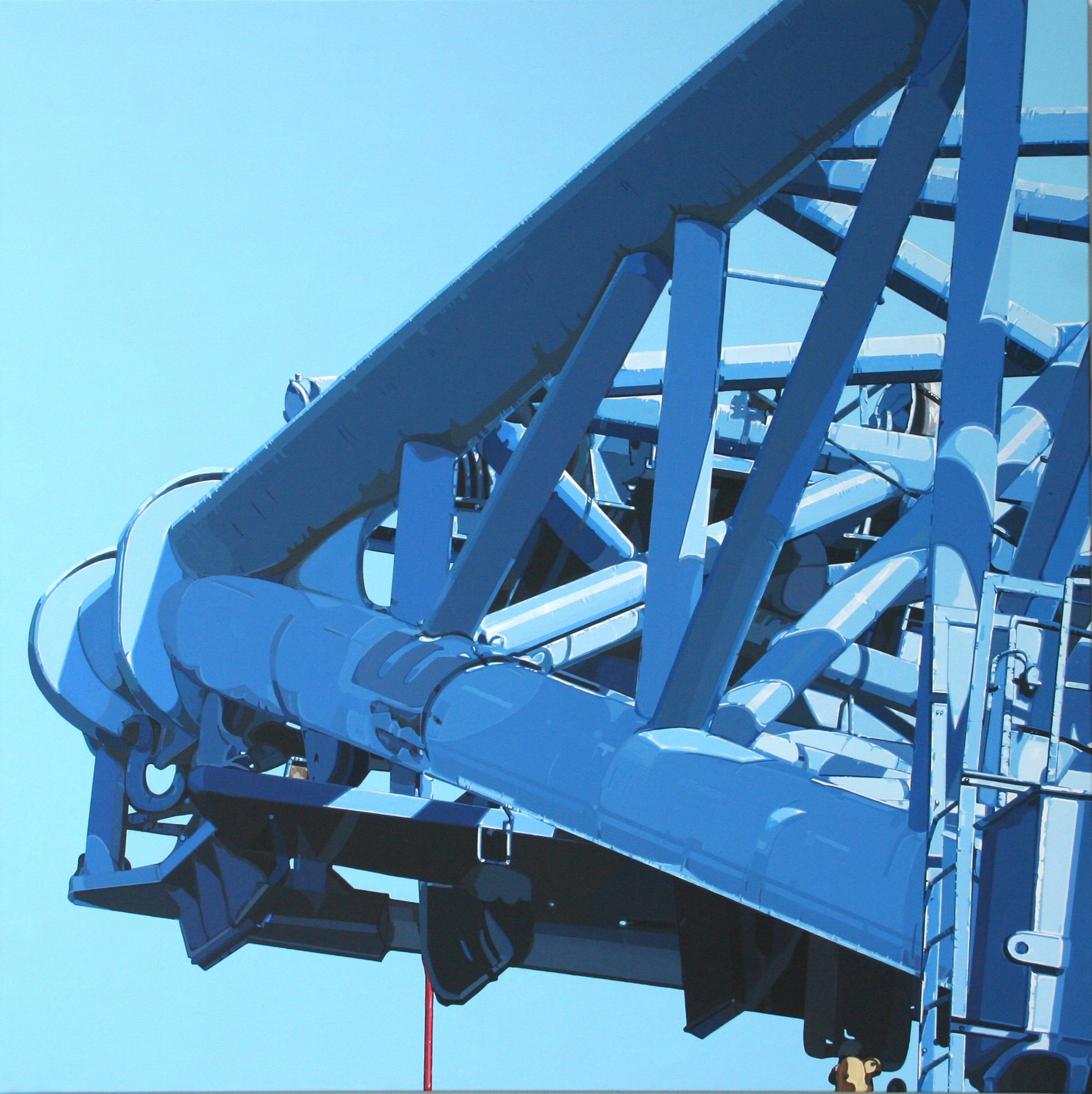 Il grande angolo è quello di una indefinita macchina industriale azzurra che sfonda con i suoi bracci di tubi e condotti tutta la profondità del quadro rubando aria e spazio al cielo, a ribadire, con un certo cinismo, l'enorme vuoto lasciato dalla dimensione umana nell'area delle emozioni e dei valori condivisi.
