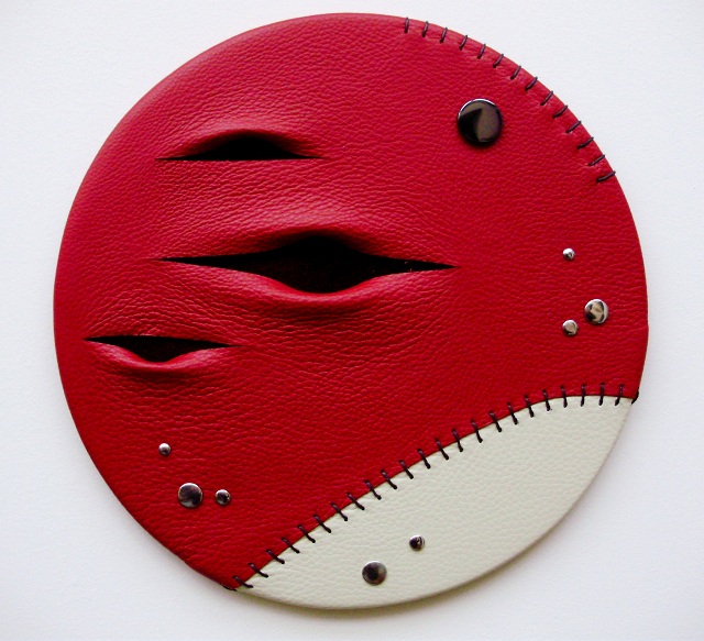 Materiali: Pelle cucita e lavorata a mano su supporto in legno, diametro 30cm.