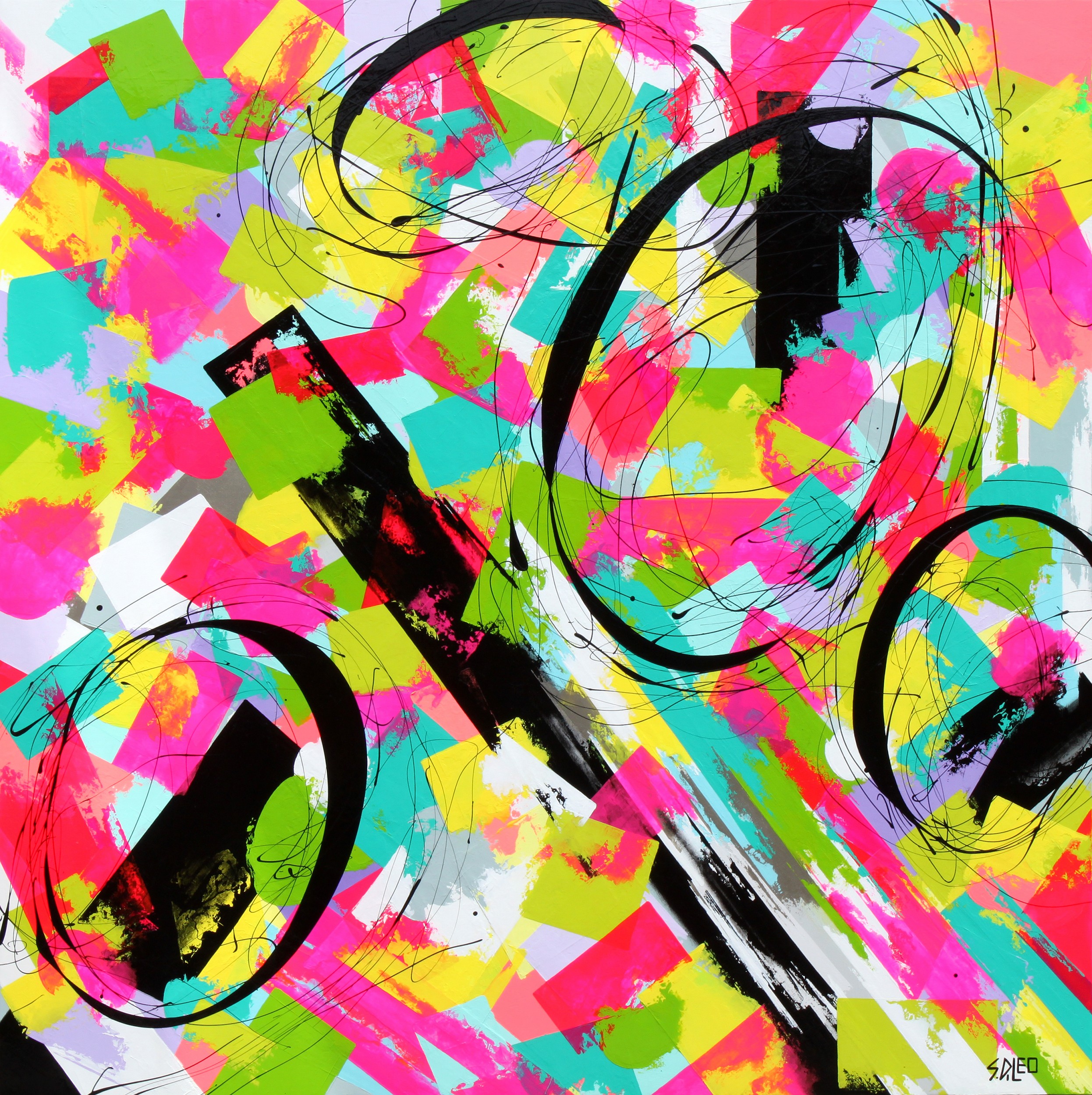 This artwork is a childhood recollection of my family summer holidays, visiting my grandmother. The yellow depicts the brightness of the summer sun and the light blue represents the calm of our time up north. The connection to nature’s beauty is symbolized by the patches of green. The coral pink represents the colour of my grandmother’s apartment hallway where my sister and I would play, while the darker pinks express her warm and loving nature. The solid black bars symbolize the many roads travelled and the white patches are the purity and innocence of childhood. The loose black fluid lines convey a sense of delight and excitement.