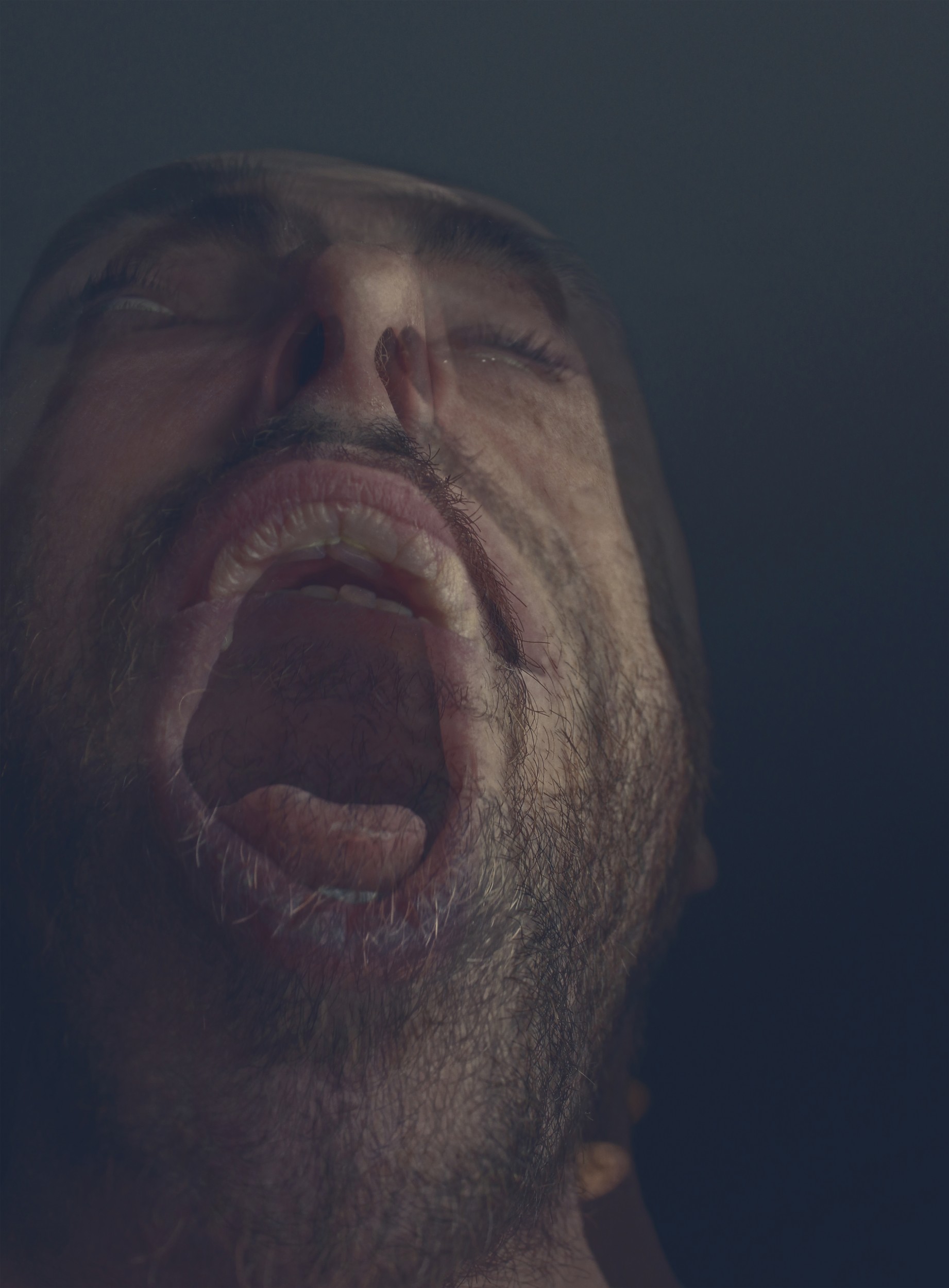 The capture, and impression, of two single/distinct instants of grief tries to render a larger, overwhelming spectrum of interstitial feelings and emotions. Colors and contrasts fade into each other, as the facial features blend across the two moments, in a unified-yet-fragmented outburst.