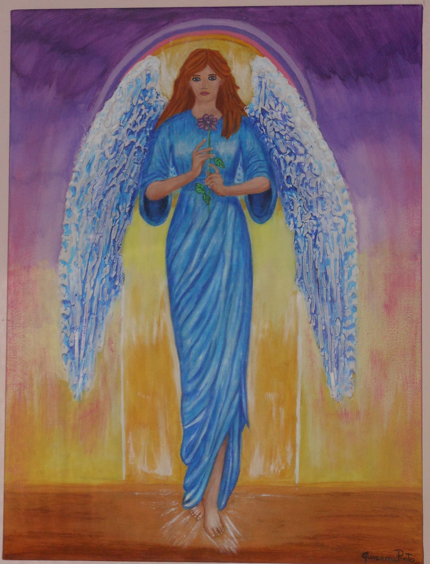 l'incontro dell'Angelo ! ti auguro a l'incontro con il tuo angelo che ti porti in dono un fiore , e l'arcobaleno beneaugurante dovuto alla luce angelica che attraversa le gocce di un temporale appena passato nella tua vita. Ogni colore dell'arcobaleno sarà meraviglioso e porterà gioia nella tua vita.