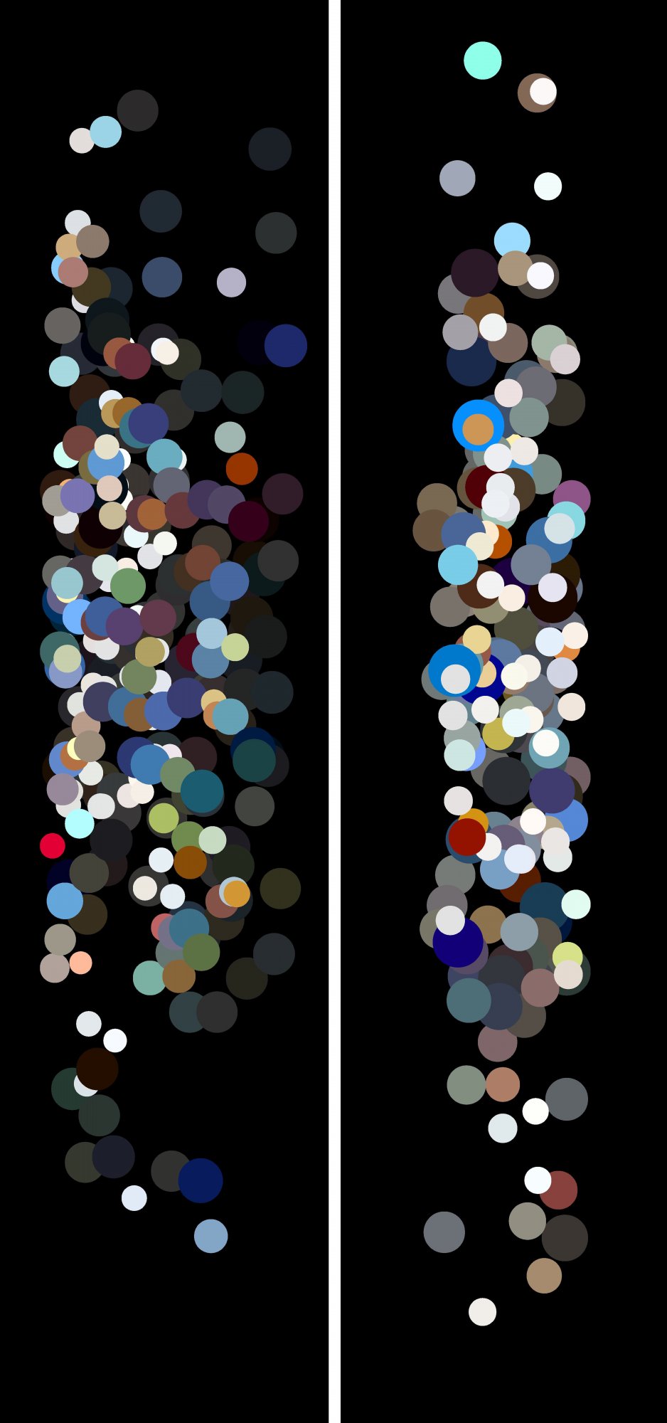 In Ka-Bo, each image contains over 200 microscopy imaging data of cell movement experiment from four different cells. When the cell moves one step, there will be a data point which stands for its position. I normalized them into [0 1] and applied the position coordinates as color indicators, which mean three data points can be utilized as RGB palette. Also, the diameter of dots derived from the original position coordinates at each point. Finally, I displayed them randomly by x-axis (horizontal) and time-lapsed by y-axis (vertical). Through these two images, people can realize how beautiful life is and be aware of those artists living in Mother Nature. I strived to be a translator between nature and people. That’s how this piece of artwork is meaningful in contemporary art, science, and education.