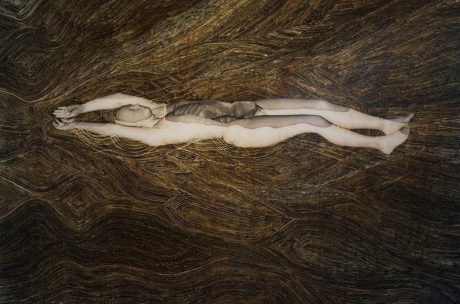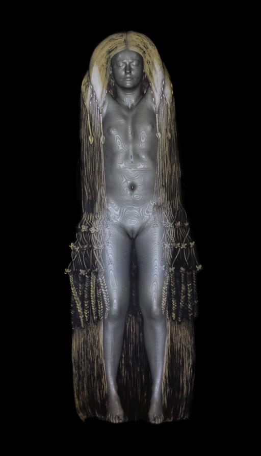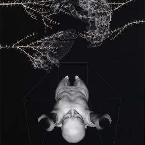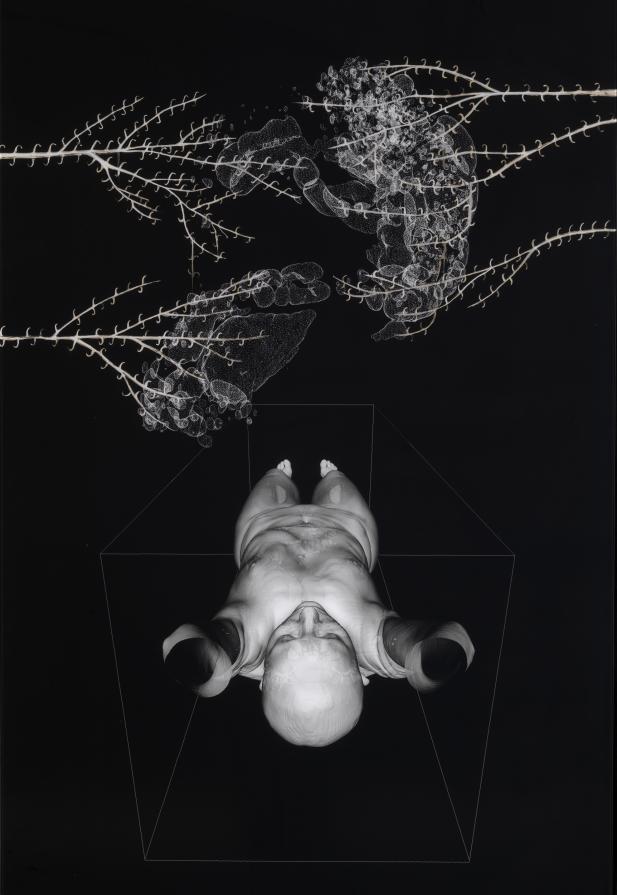 As an artist I work almost exclusively with an with an anonymised CT dataset called Melanix. Freed from having a personal relationship with the subject I work with scanned body as I would an avatar, constantly reforming and re-materialising her to suit changing ideas and impressions. Although I primarily work as a sculptor, this last series CONFUSAO is combination of digital, photography and painting; I worked with radiology software to export renderings of the scanned body that were then made into internegs to allow me to make large traditional black and white photographs that I could then paint into with photographic bleaches and inks.