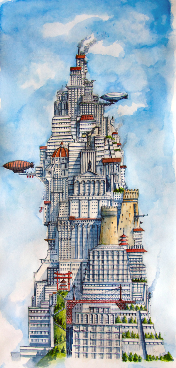 Secondo lavoro della serie Babele, città fluttuanti. Ho immaginato un mondo-torre globale in cui si fondono stili architettonici e culture diverse che coabitano in una città vibrante e ondeggiante tra le nubi. una sorta di capitale mondiale che si estende fino ai limiti estremi del cielo. Una visione positiva, pacifica ed equilibrata, in cui la verticalizzazione delle caste lascia lo spazio alla coesione multietnica in una sorta di utopia.