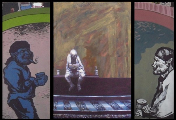 These pictures are about people who are out of society. Sometimes they ask us to help them but we don’t. We think our NO will be a lesson to them. What is the future of poor people without home? Are they satisfied with their life? I tried to answer this question by the middle picture. A drunken man is sitting the edge of a platform. He could not see the train coming. He risks his life without any purpose. He does not know why he has to live. The background of dirty color presses on the man. And we see, how bad this man feels. I tried to say that beijjars are people too.