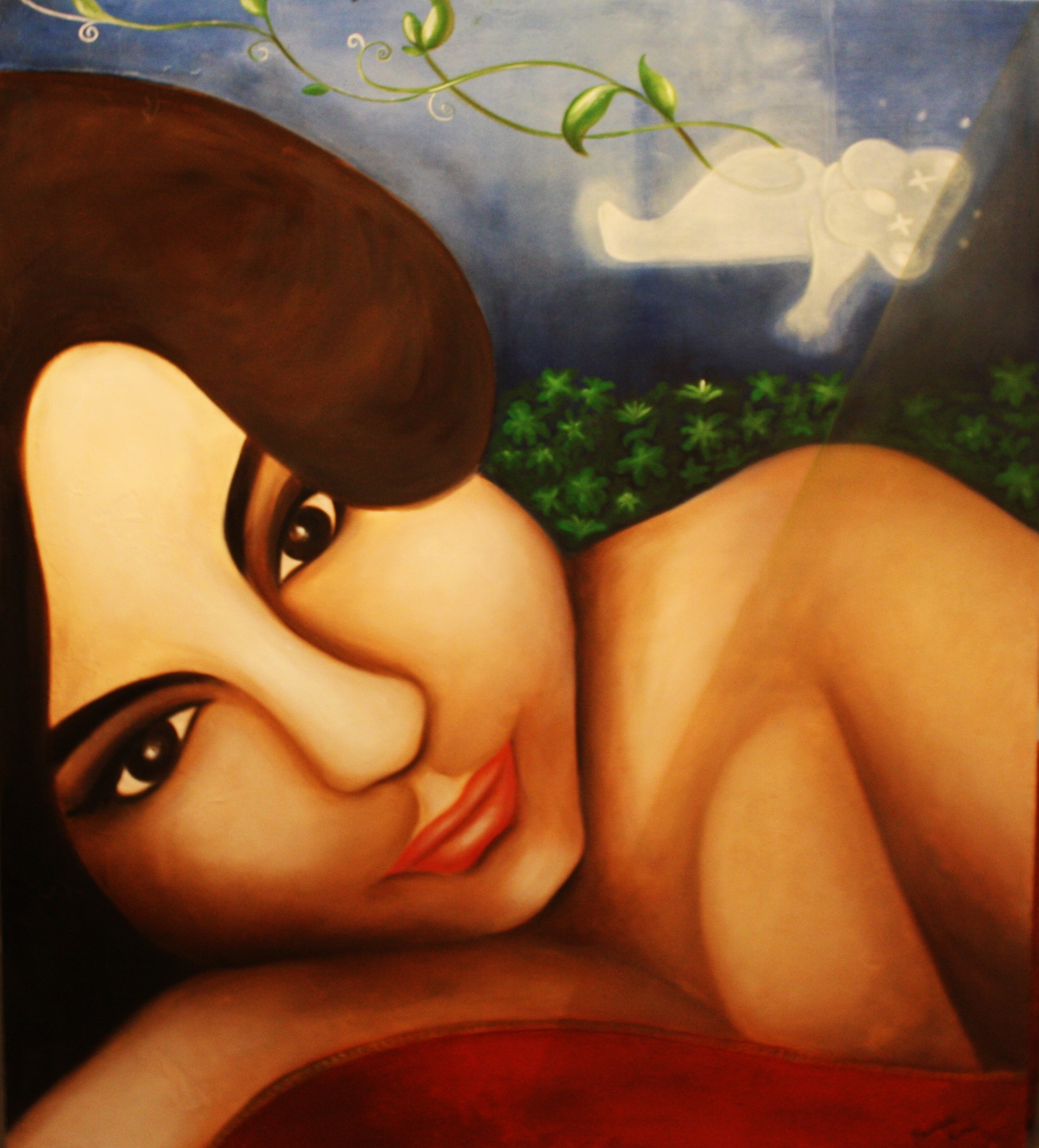Monna#Vivianne nasce naturalmente. Man mano che questa meravigliosa donna compariva nella mia vita e nei miei sogni, la riportavo sulla tela. Lei è reale, non immaginaria. Quello che emana con il suo sguardo caldo ed i suoi colori vivaci e avvolgenti riporta alla tranquillità, alla sensualità, al calore, all'essere donna. In una dimensione parallela giace un'orsacchiotta che, guardandola, rimane ammaliata da cotanta bellezza. Dal suo cuoricino nascono due rametti di foglie verdi e splendenti: rappresentano i suoi due bambini. Quando pensavo quale animale potesse accompagnarla ho immaginato mamma orsa: forte, materna, protettiva, lascia libertà ai piccoli vigilandoli da lontano. Ho scoperto poi essere il suo animale preferito.