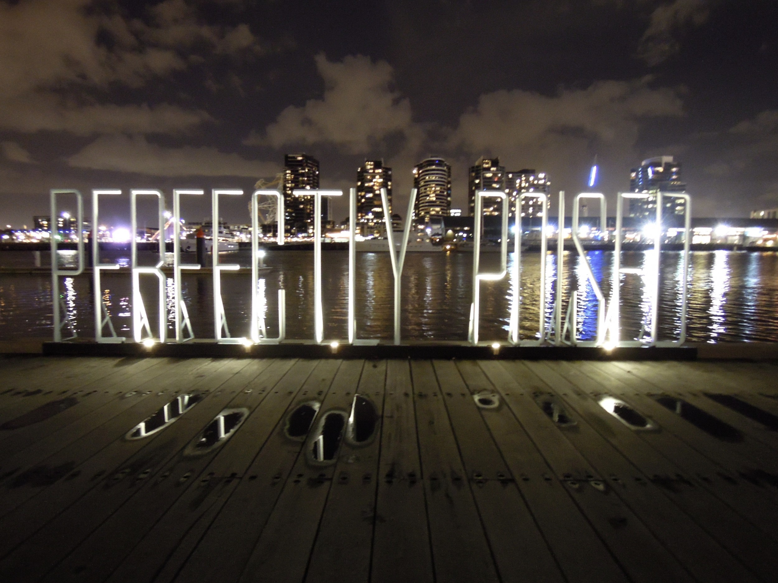 In keeping with the Docklands environmentally friendly, low energy program, “PERFECTLY POISED” was lit by low voltage LED lighting. The text was highly visible during the day and was lit with spotlights for night time viewing, allowing those taking an evening promenade to view it from afar or to be seen by those in their apartments and offices from above. The intention was to encourage people to reflect on the meaning of the text, and to capture viewer’s imagination on how these words may resonate on a multiplicity of levels.