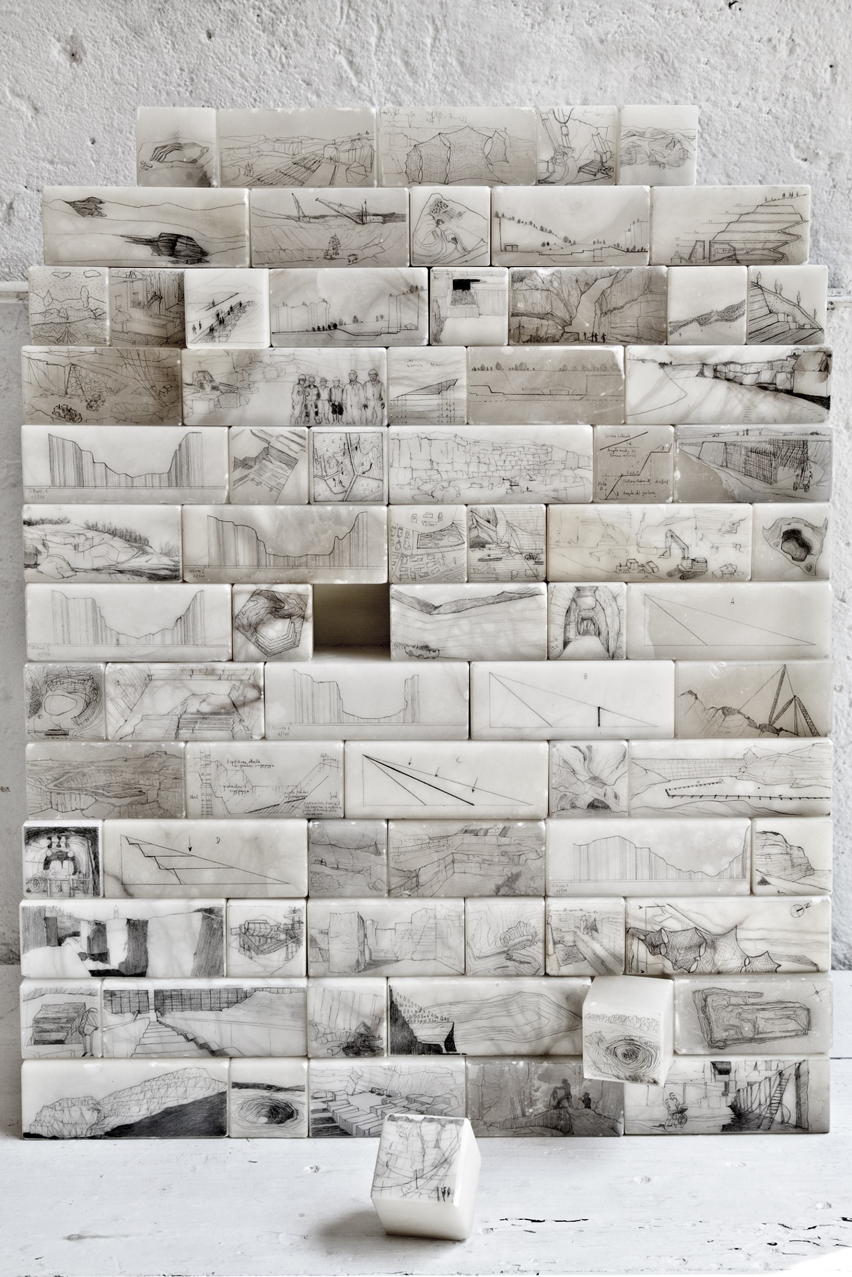 Grafite su blocchetti di quarzo trovati tra i rifiuti di un centro commerciale. Disegni liberamente tratti da foto di cave e progetti di coltivazione disponibili su internet.