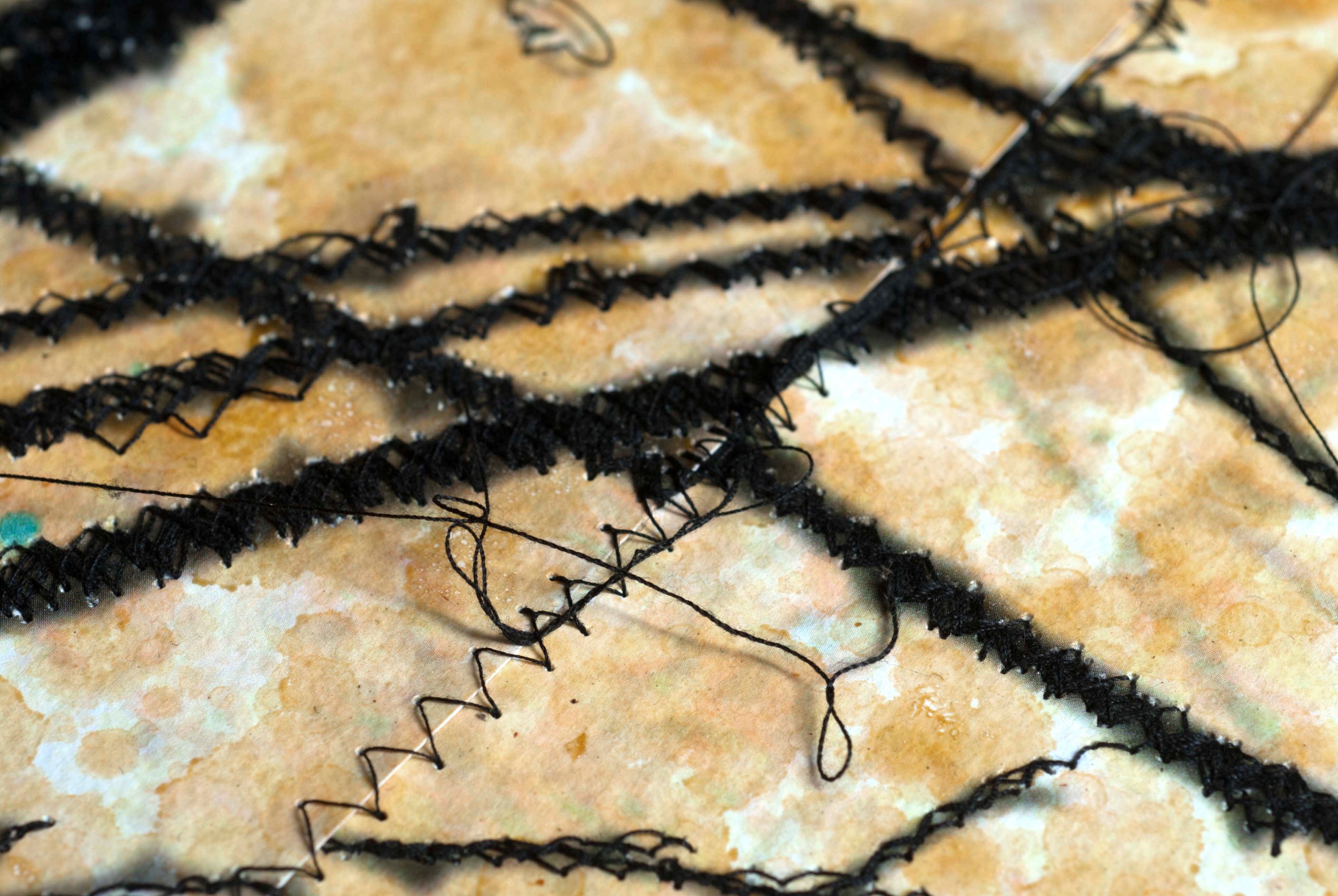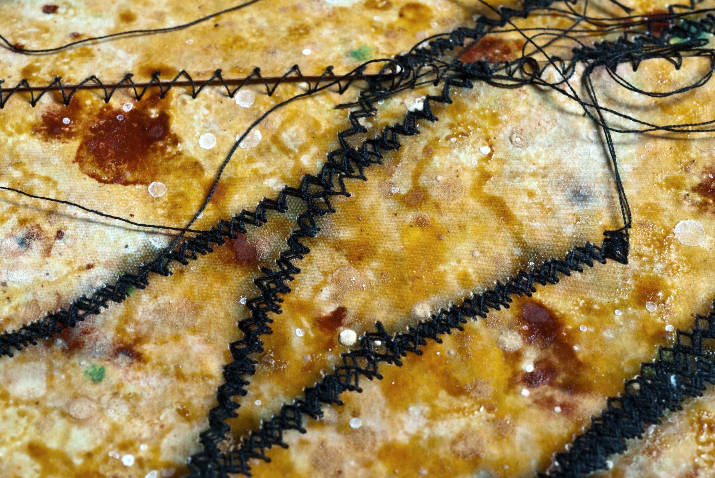 E poi i punti stretti, le cuciture, a migliaia, fitte, seguendo linee di spine, ricamando sulle ferite. Si cuce con metodo, si cuce in meditazione attiva mentre il rumore della macchina da cucire scandisce il ritmo, ore dopo ore vengono saldati tutti gli strappi, unite le incoerenze e le distanze, in una sorta di arazzo la natura arcaica esplode nella sua grandezza, a cui è data cura e omaggio e preghiera.