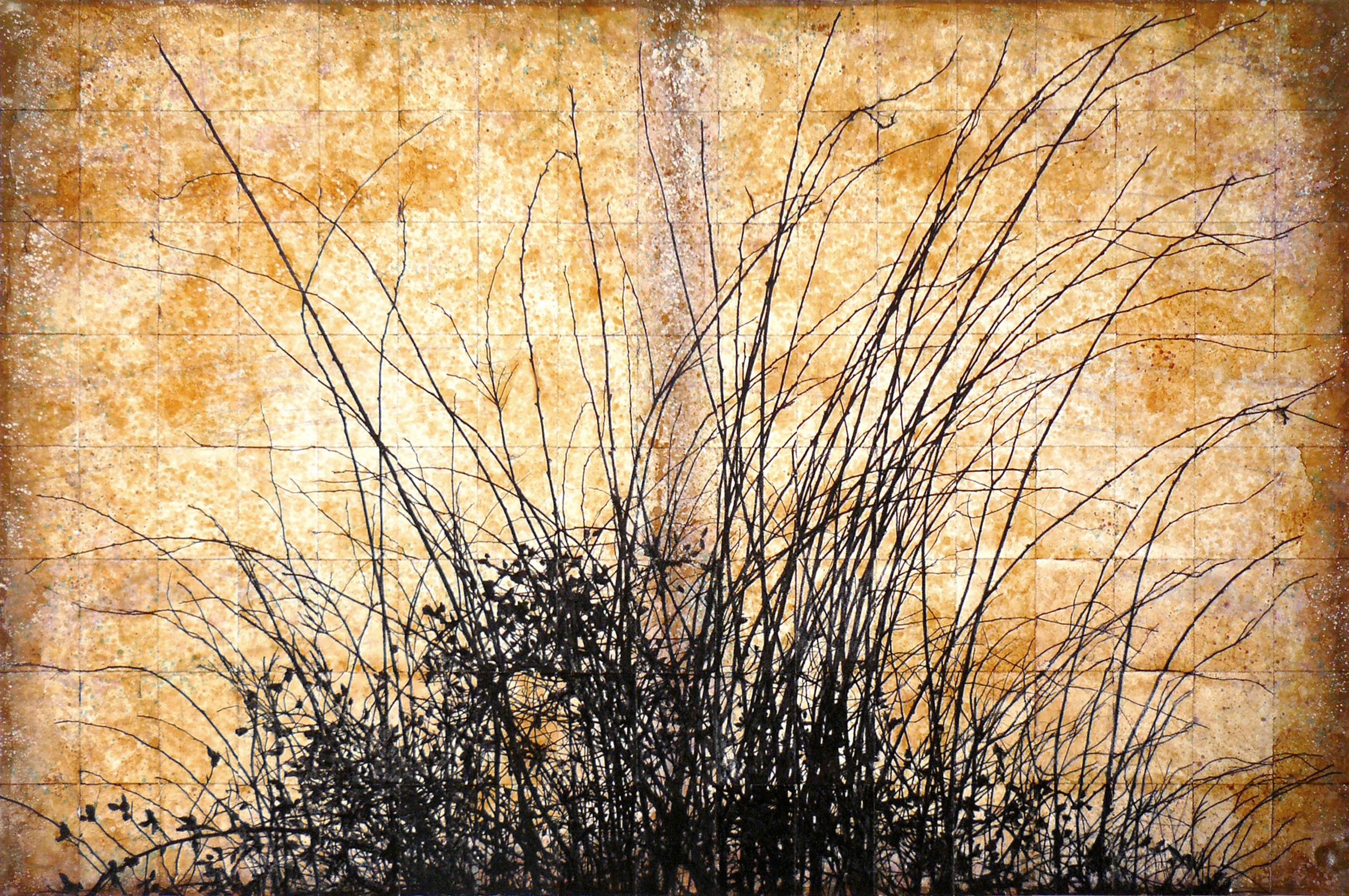 S’ intride di pigmenti terrosi la superficie di carta, sfalsando il prima e il dopo, gocciolature ambrate di gommalacca che il fuoco ridà a nuova vita. La fiamma non distrugge l’immagine, nè il suo significante, ma li arricchisce, illuminandoli di sfumature rugginose a testimone del suo passaggio bruciante. Nascosto esperimento alchemico, processo intimo.
