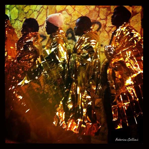 Il lavoro di Federica Cellini e’ un'istallazione basata su due livelli narrativi. Da una parte gli scatti fotografici del giorno dell’arrivo dei migranti sull’isola di Lampedusa. Una serie di ritratti scattati sul posto con un iphone. Dall’altra, l’atmosfera creata attraverso alcuni suoni sintetizzati realizzati in collaborazione con Aleksander Protic, sound designer che ha gia' lavorato con il regista serbo Emir Kosturica. I suoni raccontano la storia del viaggio dei migranti dal centro Africa, ai camion roventi lanciati nel deserto, all’arrivo in Libia, dove spesso vengono detenuti mesi, a volte anni, in attesa di raggiungere il “carico umano” sufficiente far partire un’altra barca. E poi il mare, la traversata del Mediterraneo, fino all’arrivo – per chi e’ sopravvissuto - nella piccola isola di Lampedusa.