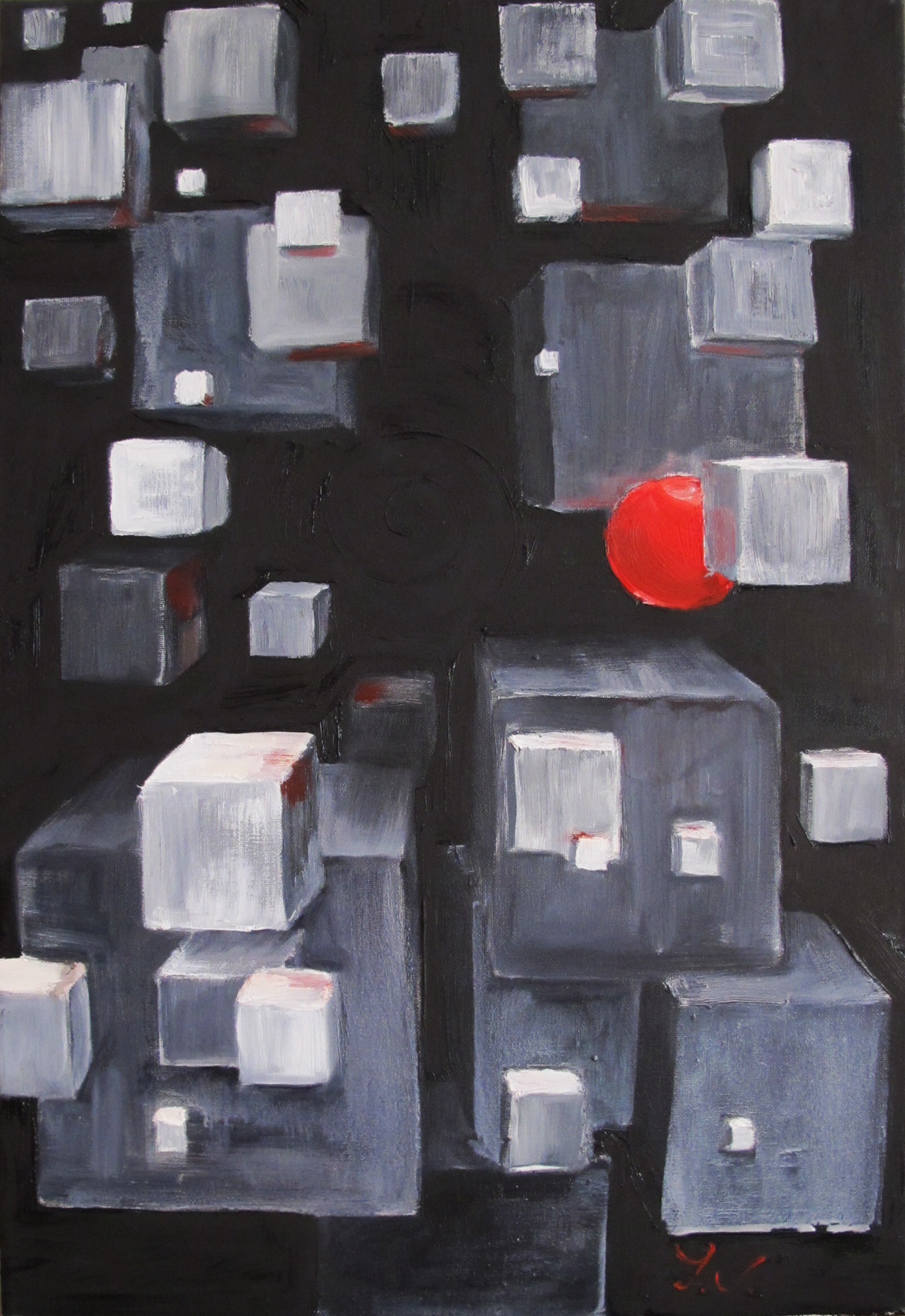 Red sphere is the creativity surrounded by gray and trivial life. This creativity does not allow you to stay passive, it pushes you to search for something different, to change this world and yourself, hopefully, for better.