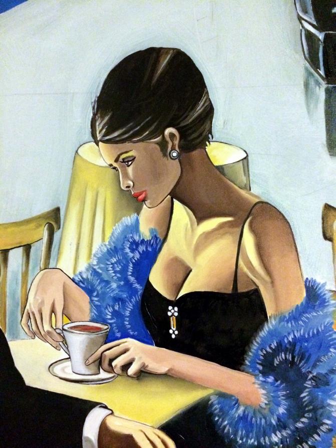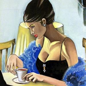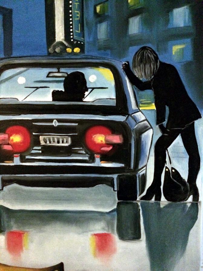Il mestiere più antico del mondo visto in versione d'alto bordo con l'elegante donna in boa di struzzo seduta al tavolo. In secondo piano vediamo invece lo stesso lavoro ma svolto sul marciapiede con la ragazza abbordata dal cliente in macchina. In miseria e in ricchezza, la tristezza resta sempre dipinta sul volto di queste donne.