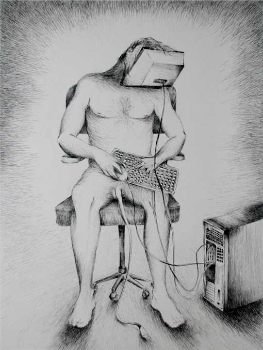 sulle mani e sulle braccia spuntano i tasti, le dita fanno click, il viso si fonde con il monitor e l'organo genitale maschile diventa un cavo USB alla ricerca la porta ideale.