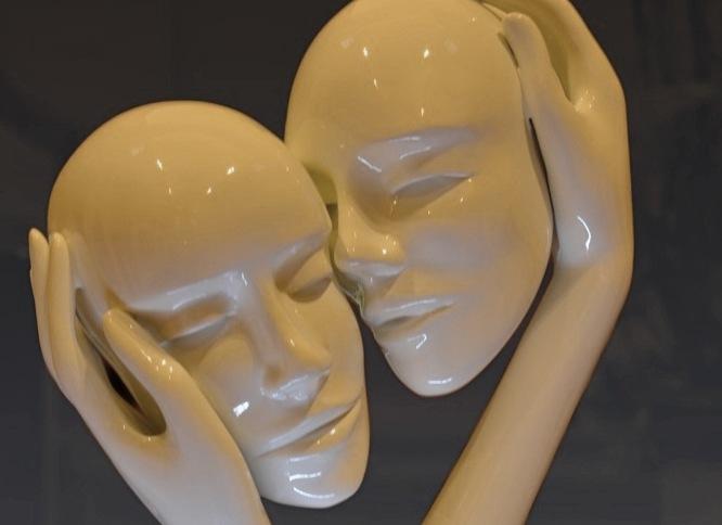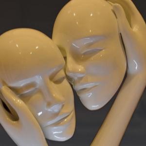 “Il Bacio” è l’espressione dell’amore eterno e universale. Si tratta di quattro fusioni separate e poi unite in questo momento di intimo amore. Non si tratta di un bacio come piacere carnale ma è sulla guancia ed appena accennato, come se fosse più il gesto e lo sfioro dei visi a conferirne l’intimità e l’atmosfera di un amore vero. I due volti sono volutamente asessuati di modo che possa essere attribuito sia ad una amore materno che a quello di due innamorati dello stesso sesso. Sì, ho di nuovo profanato il bronzo laccandolo con vernice, questa volta con il Bianco, ma questo è voluto perché il bianco è simbolicamente il colore più incolore. Il bronzo invece conferisce all’opera la sua prerogativa intrinseca nella materia: l’eternità”.