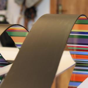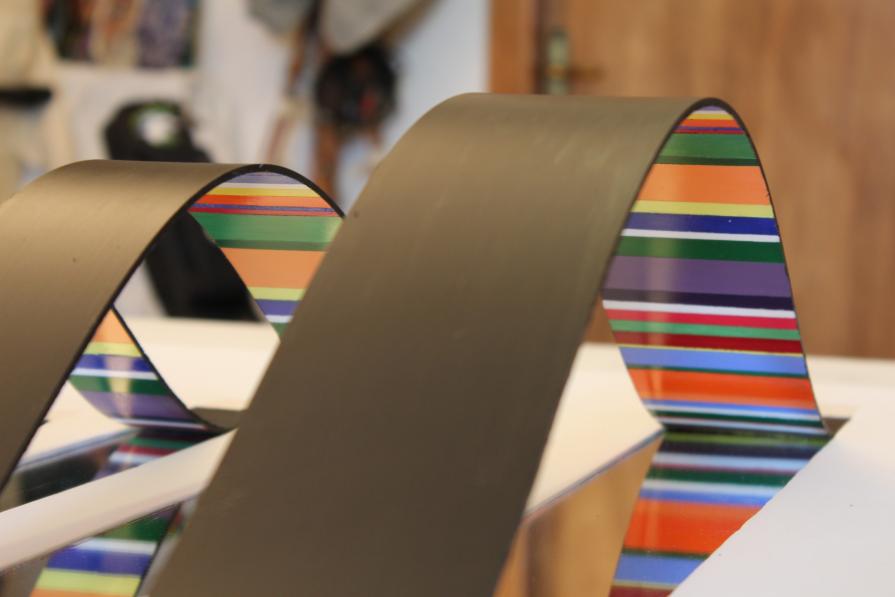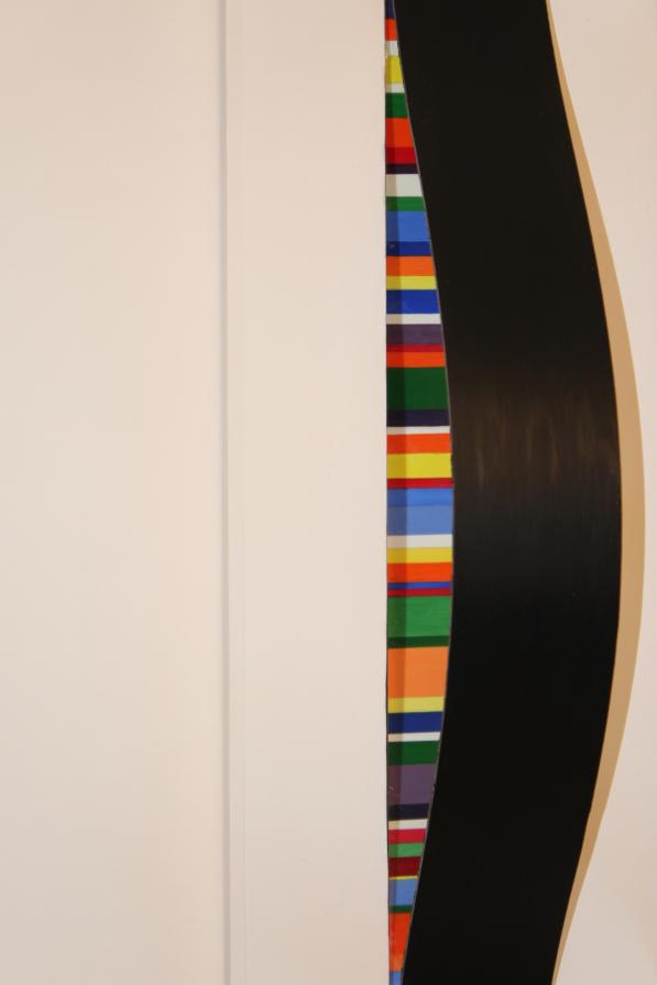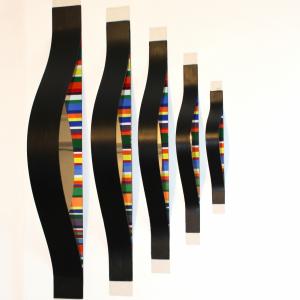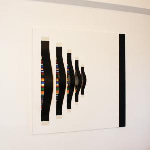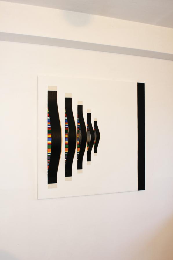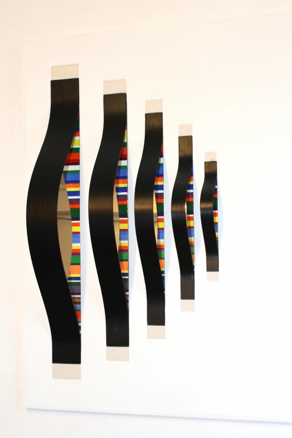 La struttura geometrica primaria, generatrice di composizioni sempre differenti, si distacca dalla superficie dell’oggetto, inarcandosi in avanti. Invade lo spazio reale e mostra una parte di sé, fino ad allora nascosta, l’anima stessa dell’opera. Creando giochi di forme e generando nuovi spazi, l’opera espande il suo spazio rappresentativo, che si muove al di qua e al di là della superficie “pittorica” attraverso l’illusione che creano gli specchi.