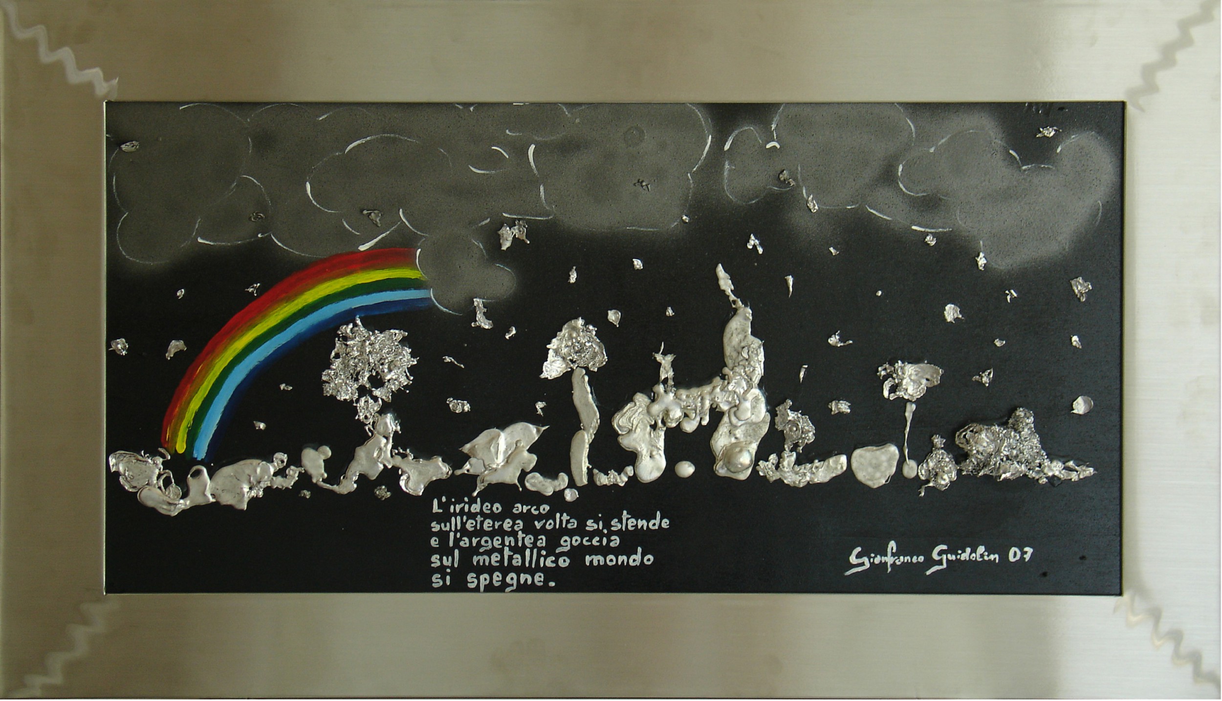 Prendendo spunto da una mia poesia, l’opera è costituita dalla fusione di due metalli, che una volta raffreddati con l’acqua, hanno dato forme diverse, utilizzate poi per comporre un paesaggio, che ben si adattava al testo poetico: “ L’IRIDEO ARCO SULL’ETEREA VOLTA SI STENDE E L’ARGENTEA GOCCIA SUL METALLICO MONDO SI SPEGNE”. Un mondo sempre più tecnologico, la cui identità si sta perdendo, confusa nell’uniformità, nel qualunquismo, nei rapporti virtuali e freddi, dove ogni cosa diventa sempre più distaccata, metallica, chiusa in un contenitore pesante, grigio, uniforme, rappresentato dalla cornice in acciaio. L’arcobaleno è il naturale simbolo di speranza che inarcandosi nel cielo, spezza il grigiore, illumina l’oscurità e riporta al chiarore, alla serenità, alla distensione.